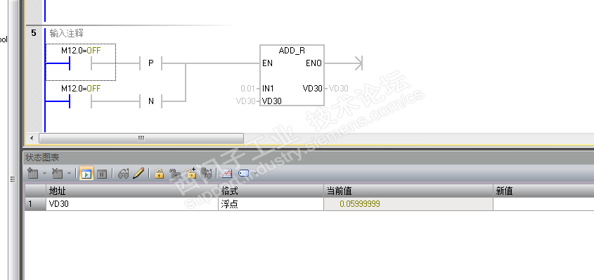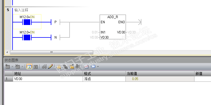 写了这么一个程序,M12.0上升沿和下降沿时对浮点数VD30每次加上0.01