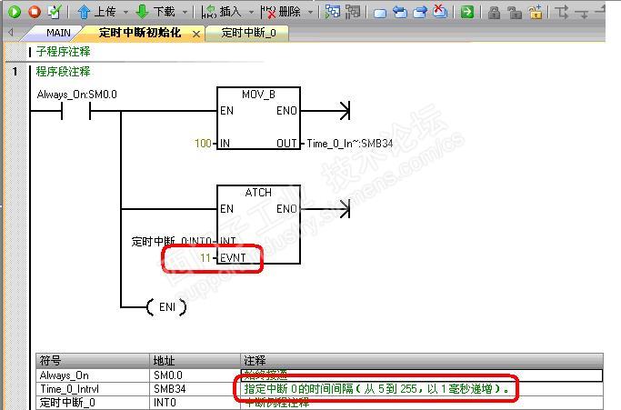 主题:回复:关于定时中断与中断事件号的对应关系你的测试,只是说明了一个情况: SMB35有一个初始值,即使程序没有设定SMB35,只要你连接了中断事件11,也会按照默认的时间触发中断 你省去给SMB34赋值,直接关联中断呢?中断子程序一样会被执行 |