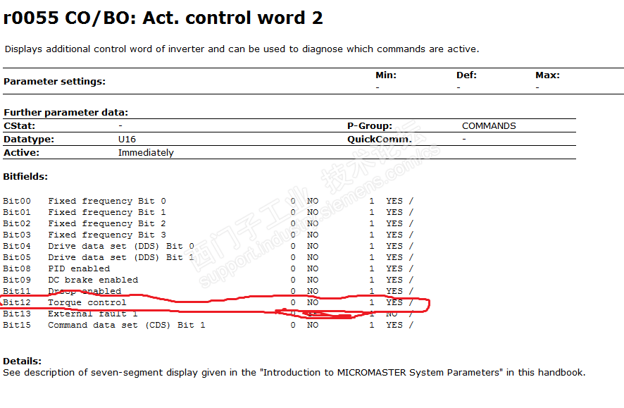 主题:MM440变频器,在无编码器的矢量控制下,偶然报故障F0453 F0001 MM440变频器,变频器是无编码器的矢量控制P1300=20,偶然报故障F0453电机堵转 和F0001过电流。 1,变频器是转矩控制的,在某种情况下,PLC给定一个转矩值给变频器,变频器就按照这个值来转矩控制。 2, PLC的转矩给定值是没问题的,我这里有8个变频器,8个变频器一模一样的,电机也一模一样的,他们的负载也一模一样的,只有一个变频器偶尔会发生故障F0453和F0001故障。 现需要解决的问题:避免这F0453 F0001故障, 我认为是从P1160 和P1161两个参数入手,但是这两个参数看不太懂。 现在的参数P1610=50 P1611=0 需要怎样修改? 如图所示这个为绿色, 就是转矩控制吧?