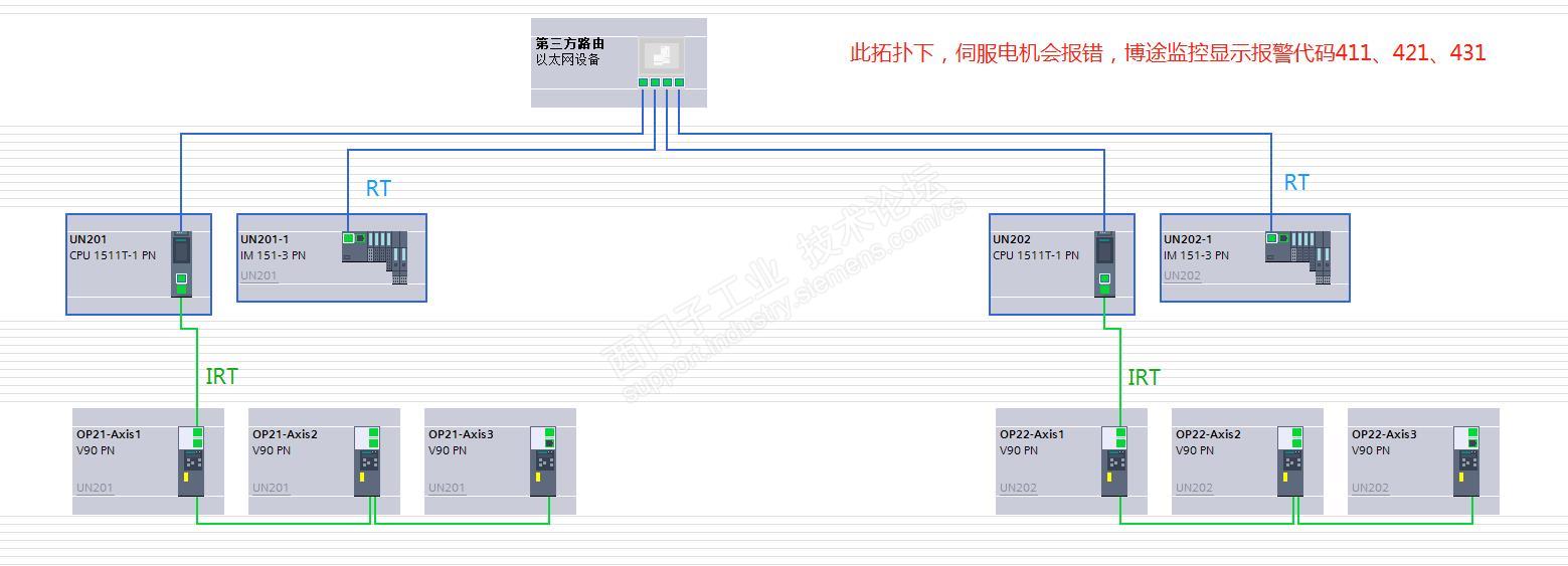 主题:1515CPU + V90PN IRT时掉站无法通讯! 最近在昆山力格样机中遇1515F+V90PN_IRT无法通讯问题 系统配置:1515F + 71个V90PN + 10个ET200S + 11个第三方PN_IO设备 +8个 菲尼克斯交换机。 网络结构:1515F.X1.P1串联所有交换机,IO设备再于交换机连接;1515F.X1.P2 连接8个V90走IRT。 ?起始V90PN全部使用Epos功能,设备通讯OK。后来由于工艺要求,8个V90PN需要齿轮同步,更改为工艺对象控制,并使用IRT方式,组态完下载后就通讯异常 不行抓个包呗,于是在1515F.X1.P1口处的交换机端口进行抓包,瞬间出现超多PN-PTCP协议帧,突然想到好像和论坛里的问题一样啊,到论坛一看,果然和论坛里是同一类型的问题,结合之前论坛跟帖,IRT通讯异常的原因是菲尼克斯交换机不能对报文进行处理,CPU会同时收到RT和IRT的两侧的多个PTCP报文,导致CPU在做时间同步计算的时候就会出现错误。 处理方式:1515F.X1.P1和交换机之间插入ET200站进行“隔离”。 困惑:1,PN_TCPN 目标地址是LLDP_Multicas就是组播,那是如何分组的?看抓包数据感觉有点像多对一的单播。 2,抓包里的源MAC地址在Pronate里居然找不到,数值上差1。 |
