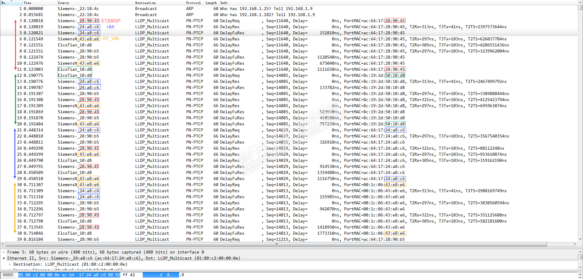 T2=Offset+T1+Delay; T3+Delay=T4+Offset. 二元一次方程,可求得Offset跟Delay。这里重点就来了,这offset跟delay不是白算的,请求不是白发的,发了肯定是要修正同步时钟的NG里面有PLC的一组测试报文,那PLC的同步时钟会不会有改变就不知道了。 NG的图中我理解,同步时钟是从连接PLC的第一个交换机开始建立的,而交换机无法了解PLC的主要地位,所以也在测试PLC的Offset跟Delay,PLC很可能会根据测试结果来修改自己同步时钟,从而使IRT的同步时钟也乱了。 而OK的图中,同步时钟就是PLC先修ET200SP(报文看不到)然后ET200SP修其它设备,逻辑清晰,PLC主要地位明显,没有报文去修改PLC的同步时钟,使得IRT同步稳定! 后补的纯属个人分析,肯定有错的,不要被我带沟里,还希望专家及时来指正! |