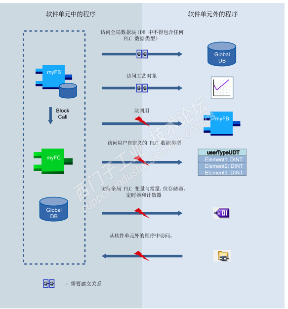 2:在软件单元中的程序块,现在已经强制使用“优化块的访问”方式。 如果你要觉得软件单元挺好的,那么请改变以前的编程习惯,用软件单元内的数据块只能用“优化块的访问”。并且,软件单元程序也只能访问全局数据块中的优化方式访问的数据块了。优化数据块与非优化数据块相比有一定的优势,同时不建议在优化与非优化数据块之间拷贝数据。详情可以参见本人另外一个帖子 3:某种程度上体现了OOP编程的一些思想,比如,封装 下图,展示了软件单元中的程序,如何访问软件单元之外的程序,这里涉及到一个重要的元素关系表。 关系表决定了该软件单元中,可以访问软件单元外全局数据块/工艺块,是否可以访问其它软件单元中的程序块。 在关系表中,可以建立该软件单元与外部三种不同对象之间的关系 ⑴其它软件单元 一旦建立了与其余软件单元之间关系,在该软件单元中,就可以访问被建立联系的软件单元里的相关程序块等(被建立联系的软件单元并不是所有程序块等都可以在该软件单元中使用。可以选择性地把相关程序块,数据类型等访问属性设置为发布状态,见下图) 需要注意的是: 软件单元不能与自己建立关系; 软件单元之间的关系是单向的!比如 在软件单元A的关系表中定义与软件单元B的关系,那么在软件单元B的关系表中就不能建立与A的关系了结果就是软件单元A可以访问软件单元B中的程序块,但是软件单元B中不能够使用软件单元A中程序块了,那怕软件单元A中的程序块访问属性也被设置为“已发布”状态。有点类之间的继承关系的味道了? ⑵全局数据块 软件单元中只能访问非软件单元中的全局数据块,软件单元外的FB,FC,UDT等无法在软件单元中使用。 同时,访问全局数据块时还有一下限制条件: 数据块中不能含有任何PLC数据类型(为什么这样做?技术限制?) 非优化的数据块(前面已提及) 数组DB(为什么?) 全局故障安全数据块 ⑶TO 4:软件单元必须只能在S7-1500 CPU并且CPU固件版本大于等于V2.6中使用 要想使用软件单元,那赶紧升级博途到15.1吧。 5.每个软件单元都可以有自己的组织快。 与早些版本的一个程序主循环+中断不一样,整个CPU中存在着多个主循环组织块在运行,有点AB PLC里的多任务概念了