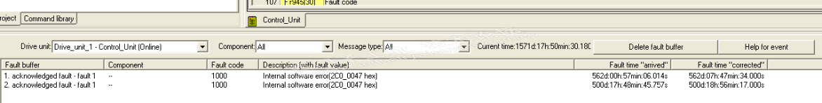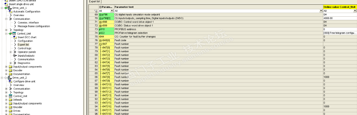 昨天现场有一台G150出现了故障: 1. 首先我将CU320进行了复位,还是不能恢复故障。 2. 然后就单独关闭G150柜子电源,因为柜子要关闭电源才能打开,柜子电源关了但CU320的电源是另外给的。 3. 再送电变频器电源还是存在,干脆把CU320电源也关了,把AOP面板电源也关了,然后在一个一个送电,故障还是不能解除,而且PLC上有BF,SF报警。 4. 我就通过工控机的SCOUT软件在线查找G150结果只查到S120的,而G150通信不上,当然也就查不到故障信息,用STEP7软件做在线硬件G150也是DP断线的。 5. G150上的AOP面板上有ALARM在闪烁,也不能在面板上执行故障清除。 什么原因,此时我关闭G150柜子电源然后用SCOUT软件在线查找结果可以找到G150驱动器,但是只要一送电就断网,真是怪。 6. 几个小时过去了,想换CU320试试,但是有些不干心,心里想要不要让设备总电源全关了,让CU320,AOP,G150柜子电源同时送电让AOP自行LOAD参数了一下。 于是我就这样做了,AOP自行LOAD参数了一下G150也就正常了。 启初我没有关总电源,没有让G150和CU320,AOP同时送电浪费了时间,要深刻检讨。 因 kdrjl的要求我今天查了记录分享如下: 历史记录是由于软件出错。 通过故障信息我选择了第一种方法,如果当时我能在线查到就好,不过也让我学到了经验。