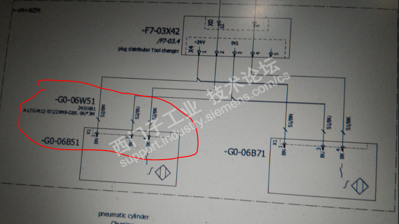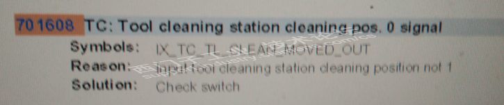 故障现象:DMG五轴连动换刀无法完成 好久没有摸机器了,这不刚从开封出差回来,听説DMG五轴连动机器坏了,我就去看看。 电气人员给我说了下情况,Q43.5不动作,换刀时吹气和清洗电机同时工作。 这台机器没有源程序,老外不肯给,从机器下了程序查Q43.5程序,Q43.5没有动作,现往前查没有程序注释根本无从下手。 我就从头查起,看报警号:701608 按i帮助键快速查HMI的手册 根据IX_TC_TL_CLEAN_MOVED_OUT在电子PDF图纸查到I40.2,I40.3和对应的阀是Q45.2和Q45.3, 根据变量表诊断 图中可以知道Q45.2为MOVE _OUT工作时应I40.2亮,Q45.3为START _POSITION工作时应I40.3亮,让操作工换刀测试Q45.3工作时I40.3亮,Q45.2工作时I40.2没亮,而I40.3亮的,説明气缸没工作。 此时操作工换刀时听到有漏气的声音,他们说换刀时要吹气清理的。 我就説你们先给我查机器内漏气的地方,结果发现气管破了,这那是吹气是漏气,缸怎么会工作。 然后把破的地方剪了用一个8mm的快速节头连一下,测试机器换刀OK 终于从黄河跳上来了,回到了长江,没有源程序模瞎瞎。开封----常州。