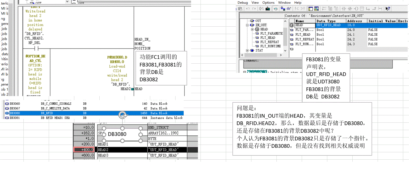 FB3081的IN_OUT端的HEAD,其变量是DB_RFID.HEAD2,那么,数据最后是存储于DB3080,还是存储在FB3081的背景DB3082中呢? 个人认为FB3081的背景DB3082只是存储了一个指针。 数据是存储于DB3080,但是没有找到相关权威说明 它现在是一个指针,又是如何访问到DB3080的呢?是和ANY一样的,需要有一个循环吗 |