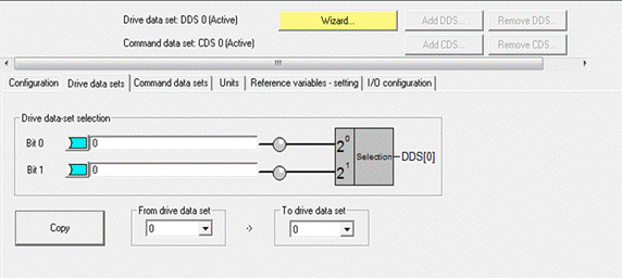 3) 在弹出的向导里完成DDS1的配置:注意在配置中有些选项只能应用在DDS0中。 图1-3 调试向导 4) 点击“Drive data sets“,在下面Bit 0 位设置一个开关量,用来切换是使用DDS0还是DDS1 。如果还有DDS2,DDS3则还需要用到BIT 1 位。 图1-4 驱动数据组切换