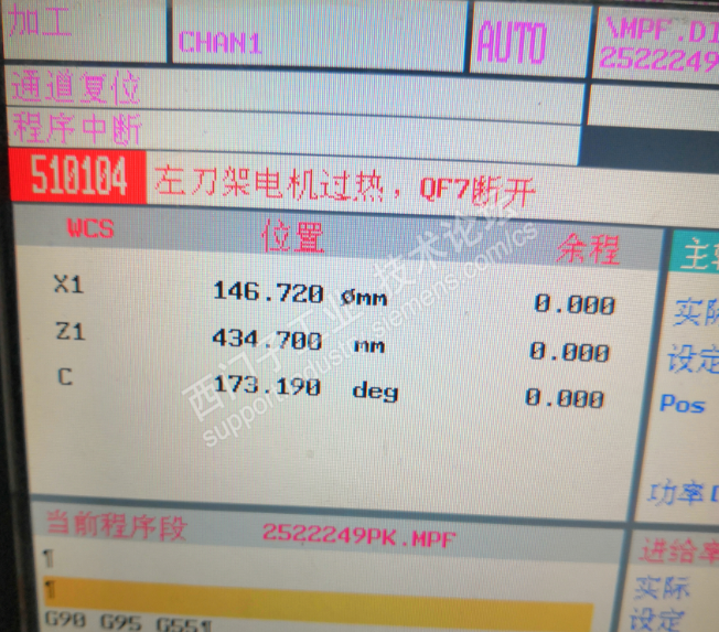 今天接到车间的保修电话,电话里说一台车床换刀时刀塔不动过了一会系统就报警了。我来到设备一看报警刀架电机过热断路器跳闸保护了。 于是先将空开复位送电,然后再继续换刀测试,当换刀动作时刀塔电机可以看到有动作但是刀塔不能旋转而且有异常响声,果断急停设备开始进行故障分析,电机有动作但是刀塔不能旋转说明电路没有问题,应该是机械部分有卡滞导致,于是找来图纸查看, 看到图纸就明白了因该是锁销没有动作导致,锁销动作的前提是图上的S1先动作然后锁销退出锁定位置刀塔可以旋转,现在是锁销不能解锁电机转不动,问题找到了就好办了,首先把设备停电(安全第一)挂锁。拆刀塔上端盖(见图) 看到中间的那个小圆盘了没,就是它没及时动作才会不能解锁导致不能换刀,正常因该是弹出来的(见图) 接下来就是各种清理,使它能上下灵活无卡滞,好了试机换刀非常顺利。 连续换刀测试都能及时完成没有任何的停顿,故障就此解除。
