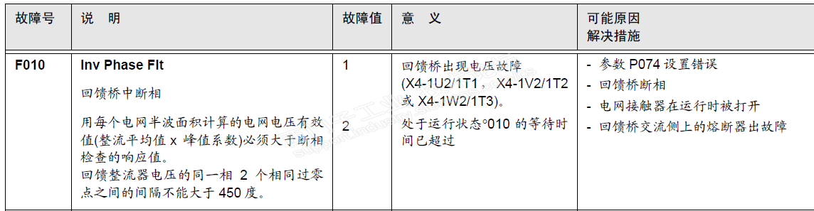 图1 F010故障 一小时过后,现场又来电话,说更换完功率接口板后,又报F103了。这个情况变复杂了呀!更换完板子把可控硅弄坏了?能怎么办呢,拆吧!心里一边极不情愿接受这个消息,一边还是让同事把12个可控硅(主从并联的整流柜)逐一拆出来测量。 SIEMENS的设计还是很不错的,可控硅都是做成了模块化,铜排一拆,就可以向外旋转。最后测出来都是没问题。于是,让同事把功率接口板清洗之后再换回来测试。