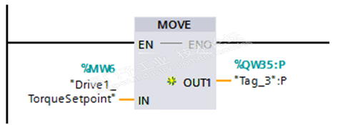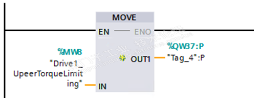 从V90PN固件版本V1.3开始,增加了750附加转矩报文,可以通过PLC实现V90 的附加转矩给定及转矩限幅控制。下面给大家介绍一下PLC中不使用工艺对象对V90 PN进行转矩限幅控制的实现方法。 1.1 概述 在许多实际应用中,不仅需要对轴进行位置及速度控制,有时还会需要对电机的转矩进行限制,比如在收放卷的应用中采用速度环饱和加转矩限幅的控制方式。 如果在收放卷应用中使用S7-1500(T) PLC和V90 PN组成的控制系统,为了减少CPU的负荷率可以采用不组态速度轴工艺对象,而直接发送轴的控制字、速度给定、转矩限幅及附加转矩给定的控制方式,本文给出了驱动转矩限幅及附加转矩给定的具体方法。 1.2 对驱动的要求 V90 PN通过 PROFINET 总线与S7-1500(T) PLC进行连接,V90 PN需要使用新固件FW V1.3,它支持附加报文750,可在标准报文上增加750附加报文来实现轴的转矩限幅及附加转矩给定功能。 1.3 实现方法 1. 组态控制报文 如果使用HSP组态V90 PN,在网络视图中为V90 PN驱动配置控制报文,在“报文”处选择“西门子报文102, PZD-6/10”用于轴的速度控制,在“附加报文”处选择“附加报文750,PZD 3/1”用于附加转矩及转矩限幅控制: 750报文包含: 3个控制字:分别为附加转矩给定、转矩上限幅及转矩下限幅 2. 编写轴控制程序 (1) 起动停止轴 (2) 轴的速度给定 (3) 轴的附加转矩给定 (4) 轴的附加转矩上限给定 (5) 轴的附加转矩下限给定 注意:转矩给定及转矩上下限幅给定4000H代表驱动中的P2003。 3. 可以通过V-Assistant软件对附加转矩、转矩上下限幅给定及转矩实际值进行监控