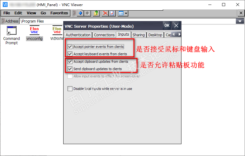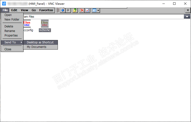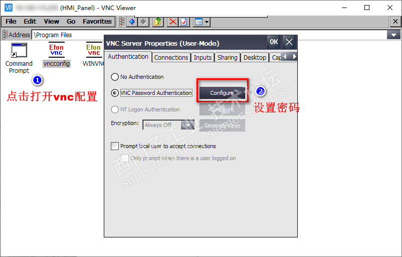 本文主要讲触摸屏的远程的远程VNC连接。 01 需求说明 最近遇到一个需求,公司研发部想在办公室就可以监控厂里烤炉的运行和温度情况,除了开发新的监控界面外,另一种办法就是通过VNC连接,西门子有相关的选件sm@rtserver,只是在博图V14之前是需要另外购买授权的。西门子触摸屏的系统是基于Windows CE的,一般Windows常用的VNC服务器软件没法在此系统上用。我在网上找到一款第三方的开源VNC服务器软件——Efonvnc Server,支持Windows CE5.0及以上的系统版本。 Windows CE是微软公司嵌入式、移动计算平台的基础,它是一个开放的、可升级的32 Bit嵌入式操作系统,是基于掌上型电脑类的电子设备操作系统。它是精简的Windows 95,Windows CE的图形用户界面相当出色。最新版本是2011年9月发布的Windows CE 7.5,以后并没有更新。 经过测试达到了需要的效果,网络图如下: 02 操作步骤 这两步比较关键,起先我为了测试直接把软件放在U盘里运行,并没有拷贝软件到\Program Files,设置好密码后过程也没有错误提醒,但是测试连接怎么都连接不上,说没有设置VNC的服务器密码。折腾了一段时间,最后将软件放到\Program Files中相同的操作立即就好了。 总结了下,VNC服务器的密码应该是放在注册表中的,此软件的开发者另一款软件就是导出CE系统的注册表的。从U盘运行时,并没有将密码信息保存到注册表中。由于他的那款注册表导出软件没有x86版本的,因此没做验证上述想法是否正确。 这三张图没什么坑需要注意的,只是需要将软件设置为开机启动。 这里有个坑,就是在上面设置并测试完成功后,需要按下“Save Registry”和“Sava Files”保存下注册表和文件。否则下次启动后放在\Program files中的文件会被清除。 03 总结 相比rm@rtServer优点: 1.不用下载触摸屏程序和改变程序的设置,尤其是在你没有源程序或不允许更改的情况下,这点更为关键。 2.省钱,不需要授权,相对于博图V14之前说的,V14以后也不需要另购授权了,西门子良心。 3.注意网络安全和远程操作的风险性。