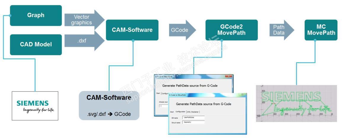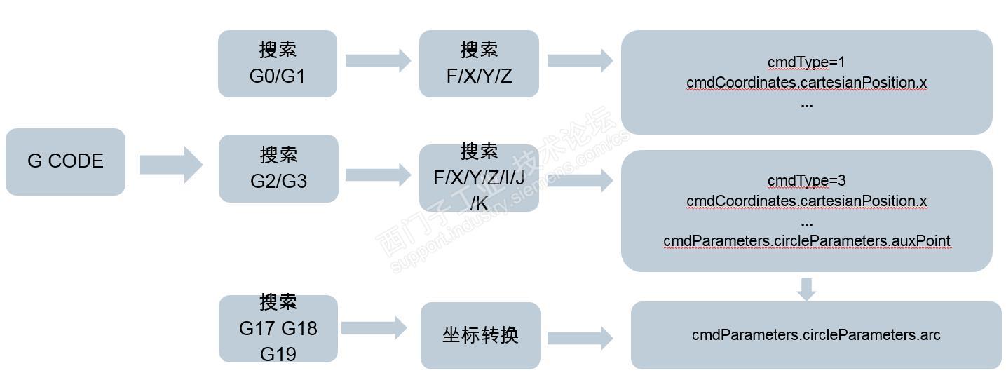 在组态时需要将多个电气轴关联到kinematic工艺对象中,用户通过专用指令编程实现运动系统3D的直线和圆弧运动。 图1 运动系统工艺对象的基本工作原理 图2 运动系统工艺对象中轴的互连 同时西门子针对kinematic运动系统出了一个LKinCtrl库,方便用户编程。库LKinCtrl为kinemati工艺对象提供在命令列表中轻松编程和控制路径运动的功能。通过库运动控制,用户可以轻松控制工艺对象以运行预定义的路径运动。与在用户程序中执行和处理多个单个运动命令不同, LKinCtrl仅使用一个核心功能块MC_MovePath控制Kinematic工艺对象。路径信息由命令列表提供。支持的运动命令类型是线性的和圆形的,绝对和相对的。只需控制输入,就可以执行暂停,中断和继续路径运动。同时,提供了有关路径执行状态以及错误诊断等的详细信息。 图3 LKinCtrl库控制原理 二、G代码的标准应用 西门子在发布LKinCtrl库同时也发布了基于LKinCtrl库G代码应用,原理如下图所示。 图4基于LKinCtrl库G代码官方应用原理 ? 操作步骤: 1. 通过外部CAM软件生成符合要求的G CODE代码。 2. 使用GCode2MovePath软件把G CODE 代码生成PLC用的路径数据PathData。 3. 需要在博图软件中离线生成MC_MovePath支持的DB块,DB块下载到PLC中。 4. 执行MC_MovePath功能块实现路径运动。 存在问题:G代码数据必须通过TIA 软件生成数据块并下载,需要工程师来操作。 三、LabVIEW和OPC UA相关知识 3.1 LabVIEW简介 LabVIEW是一种程序开发环境,由美国国家仪器(NI)公司研制开发,类似于C和BASIC开发环境,但是LabVIEW与其他计算机语言的显著区别是:其他计算机语言都是采用基于文本的语言产生代码,而LabVIEW使用的是图形化编辑语言编写程序,产生的程序是框图的形式。 3.2 LabView和OPC UA在1500T G代码应用原理 图5 LabView和OPC UA在1500T G代码应用原理 ? 操作步骤: 1. 通过外部CAM软件生成符合要求的G CODE代码。 2. 通过LabVIEW编写的G代码转换软件转换成数据包。 3. 通过LabVIEW编写的G代码转换软件将数据包通过OPC UA通讯修改PLC中的路径数据块。 优势:可以实现G代码在线修改,普通操作工即可操作。 缺点:OPC UA传送数据需要时间。 3.3 LabVIEW程序执行原理 通过LabVIEW编写的G代码转换软件首先需要将G代码的NC文件转换成所需的数据,数据需要通过符号分配到PLC的变量中。目前支持G0、G1、G2、 G3、 G17、 G18、 G19。 图6 支持的G代码 图7 G代码转换原理 图8 LabVIEW部分程序框图 3.4 OPC UA的数据传输 OPC UA主要作用是将G代码转换出来的数据传输到对于的DB块变量中,传送数据如下图所示: 图9 OPC UA 数据传输 本例LabVIEW编写的软件为OPC UA客户端,1500T作为OPC UA服务器。1500T设置内容如图10所示,激活PLC的OPC UA 服务器,设置OPC UA地址和许可证,此次没有设置OPC UA 中与安全的设置。还需要特别注意自定义数据类型和用户数据的DB块处需要把OPC UA 读写打勾,否则无法读写变量。 图10 1500T OPC UA 服务器设置 图11 变量的OPC UA的读写权限设置 图12 LabVIEW中OPC UA相关程序框图 四、G CODE 软件操作步骤 4.1 使用CAM软件生成G代码。 图13 在CAM软件中生成所需G代码 4.2 启动应用程序 图14 启动应用程序 4.3 选择NC文件
