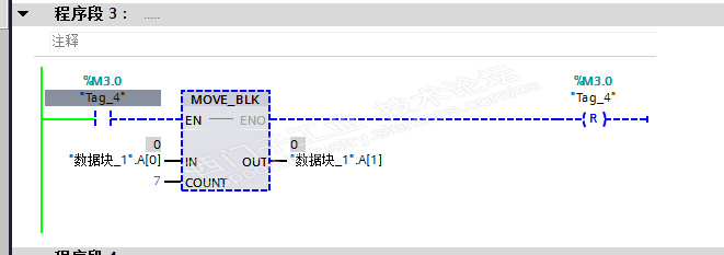 再执行一次块移动 B数组完全是不需要的。 这个功能可以作为数据记录,非常方便,可以替代FIFO; 块移动内部肯定不是循环。对数组每一个元素进行循环操作时,临时空间只有一个元素长度,零敲碎打,好比打游击战;如果解放战争还用游击战的策略,国庆节不知道要延期多少年?块移动是以N个元素整体移动,好比大兵团作战,以空间换取时间,效率高。 最近在***里听人说起梯形图是低级语言,TIA里的梯形图早都不是s7-300里面的梯形图了!大陆解放70年了(台湾还没解放,不能说全国),我们的思想还没解放。