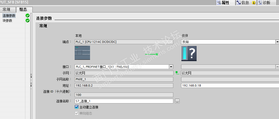 今天在做S7-1200与S7-400的通讯时,怎么也通讯不上。S7-1200采用PUT,GET读取400数据。 之前直接用指令的向导配置一下,就能和其他1200走S7通讯 但是和400这样简单设置一下,根本不行。 后来想了很久,问题一定是出在TSAP 上, 关键博途的这个藏的太深了,找了好久才找到,不是老码头,谁能找得到呢。 把TASP一设置,通讯立马就好了。 把这个TSAP说明附上。 为 S7-1200 组态 TSAP 对于 S7-1200 CPU(固件版本为 V2.0 或更高): "SIMATIC-ACC"<nnn><mm> nnn = 本地 ID mm = 任何值 对于 S7-1200 CPU(固件版本为 V1.0): <xx>.<yz> xx = 连接资源号 y = 机架号 z = 插槽号 TSAP 结构取决于伙伴 S7-1200 CPU 的 TSAP 组态取决于相关固件和远程连接伙伴。 当 S7-1200 CPU 与 S7-300/400 CPU 进行连接时,S7-1200 CPU 也会使用一个包含连接资源的 TSAP 组态。 请参见不同连接组态的以下 TSAP 示例 两个 S7-1200 CPU(固件版本均为 V2.0)之间的连接: S7-1200 CPU“A”(固件版本为 V2.0,本地 ID 为 100): TSAP: SIMATIC-ACC10001 S7-1200 CPU“B”(固件版本为 V2.0,本地 ID 为 5AE): TSAP: SIMATIC-ACC5AE01 两个 S7-1200 CPU(固件版本分别为 V2.0 和 V1.0)之间的连接: S7-1200 CPU(固件版本为 V2.0,本地 ID 为 1FF): TSAP: SIMATIC-ACC1FF01 S7-1200 CPU,固件版本为 V1.0(机架 0,插槽 1,连接资源 03): TSAP: 03.01 S7-1200 CPU(固件版本为 V2.0)与 S7-300/400 CPU 之间的连接: S7-1200 CPU,固件版本为 V2.0(机架 0,插槽 1,连接资源 12): TSAP: 12.01 S7-300/400 CPU(机架 0,插槽 2,连接资源 11): TSAP: 11.02