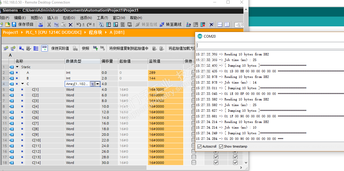 之前侄子有课外作业需要使用Arduino实现小功能,正好Snap7上也有库,所以就试了下。 Arduino官网 snap7库 http://settimino.sourceforge.net/ 软件全貌 1.建立连接 2.读取 3.监控