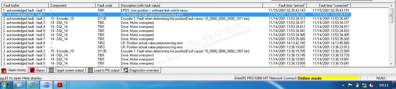 我想问一下各位,上图中所说的故障值(位,0-31位)是在哪里进行查看?如果是在r949中查看的话,r949一共64位。也就是上图报警信息中100000000000001011正好是对应r949[25]=131083,无论怎么看也没想通32个故障值改在哪进行查看。 |