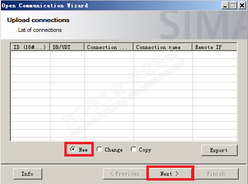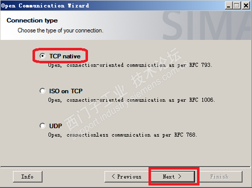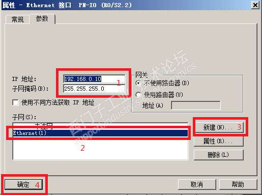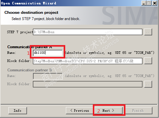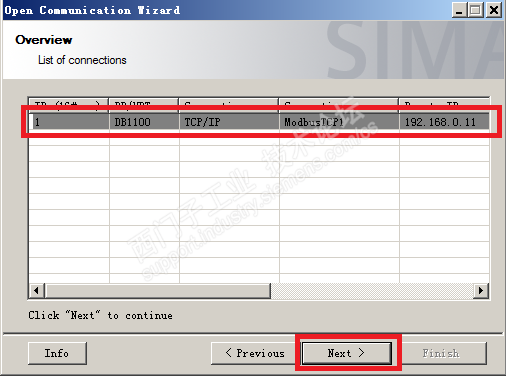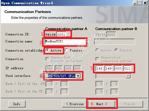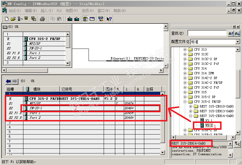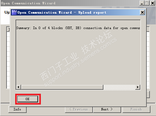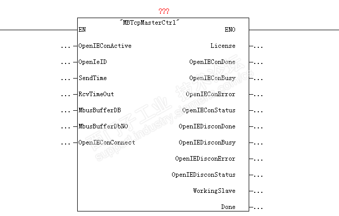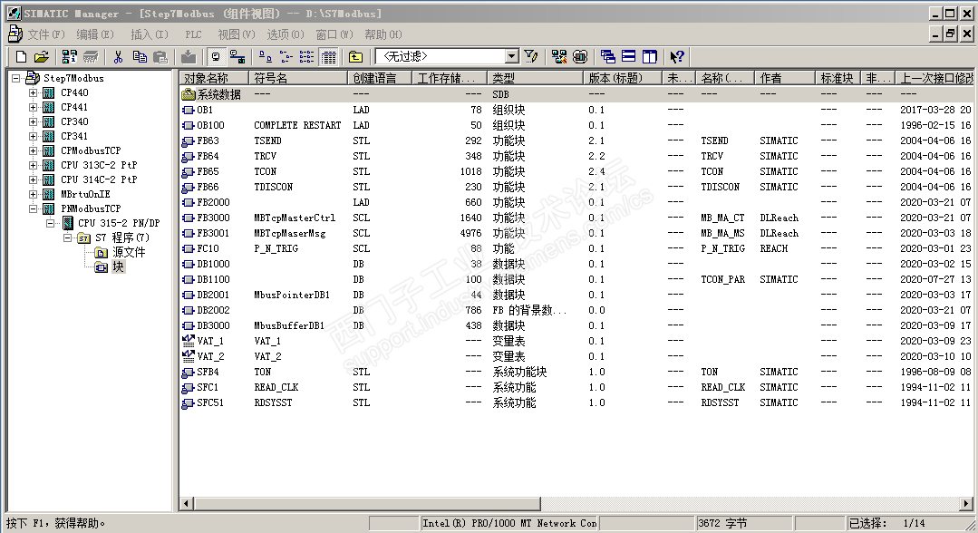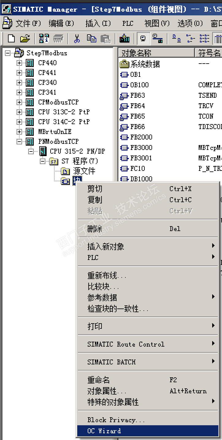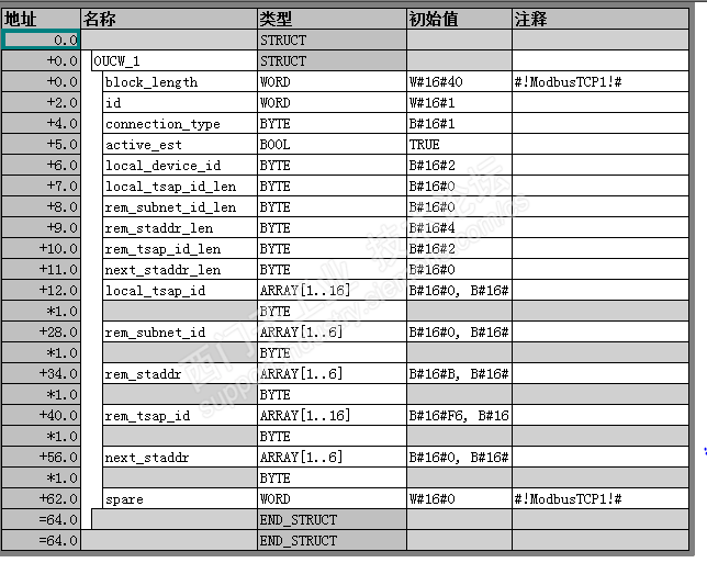 主题:S7-300 400 PN口在STEP7环境下开放式以太网通信 实现MODBUS TCP主站通信 一、 概述 本文描述的程序文件可以在西门子300 400通过CPU本体以太网口,以开放式通信方式实现MODBUS TCP 主站通信。 本程序特点: 1. 无需官方授权。 2. 实现MODBUS RTU 功能号1、2、3、4、5、6、15、16。 3. 支持单台CPU下多网口通信,一个连接使用一套程序,互不干扰。 4. 可单条或多条轮询指令 离线,即从站掉电,可手动让其离线,减少轮询时间。 5. 程序量再大也不必担心CPU扫描时间,因为未运行的指令会跳过。 6. 每条指令单独返回错误信息。 7. 不必担心程序块和数据块多,支持多重背景。 8. 程序组态直观,简单,方便,灵活。 二、硬件支持 所有支持关于通信网络施工,尽量选择西门子以太网绿皮电缆及,你胡弄网络,网络就胡弄你,所以质量可靠的硬件是保证通信正常的前提。通信网络的布线要保证EMA电磁兼容性,远离强电及强磁场。 三、硬件组态 现以CPU315-2 PN/DP为例进行硬件组态说明 1. 添加机架及CPU315-2 PN/DP到机架,双击PN-IO-1如图: 2. 常规属性页,点CPU以太网接口属性按钮。 3. 加入子网,没有的话新建。设置IP地址和子网掩码,如果需要路由则还需要设置网关。单击确定完成,保存并编译硬件组态。 四、 开放式以太网通信组态 1. 开放式以太网通信向导的安装 开放式以太网通信向导是STEP7安装光盘根目录的Optional ComponentsOC Wizardsetup.exe。正常安装就可以,此向导软件不需要授权。 2. 运行开放式以太网通信向导,块上右键,选OC Wizard 3. 这里点OK 3. 这里可以新建,改变,复制开放式通信连接,我们选择新建,点击Next。 5. 我们这里选择TCP native,点Next。 6. 我们是与第三方通信,所以我们选择B设备为不是S7-CPU。点击Next。 7. 1.Connection ID:连接ID可以任意,但不能重复,ID号记下来,在程序中会用到。2.Connection name:连接名称可以任意。3Active:主动,我们这里选择PLC主动建立连接。4.Used interface:这里选择使用的接口,我们选择CPU315/317,5.这里填写从站IP地址。6.点击Next。 8. 这里我们要填写从站的TCP通信端口号,通常从站的端口号为502。点击Next。 9. 这里是建立开放式通信的连接指针数据块,可以任意。点击Next。 10. 这里是建立好连接的列表,点击Next。 11. 这里问你是否还配置其它的连接,点Finish。 12. 点“是”关闭向导。 13. 这是向导建立的通信连接用的数据块,具体说明见其说明文档。 五、 程序说明及使用方法 1. 您得到的程序如图: 这是由STEP7归档后文件,应使用STEP7恢复命令,恢复后会看到项目已经打开。 2. 程序工作原理 3. 程序块功能说明: MbusPointerDB:用户数据块。可以是单个数据块,也可以是多个数据块。从站返回的数据保存在这个数据里,向从站写入的数据也在这个数据块里。 MbusBufferDB:缓冲区数据块。一个缓冲区数据块对应一个通信连接。将要发送的数据在这里进行校验操作,接收回的数据同样在这里校验操作。 MBTcpMaserMsg:主站轮询指令功能块。可以单个块运行,也可以多个块轮流运行。根据输入参数决定把哪些用户数据放入缓冲区数据块,再将从站返回数据放回用户数据块。注意:同一时刻只允许一个主站轮询指令工作,否同返回06错误。 MBTcpMasterCtrl:主站通信控制功能块。一个通信控制功能块对应一个通信连接。主要功能为发送和接收与从站的通信的报文。 4. 功能块参数说明 MBTcpMasterCtrl