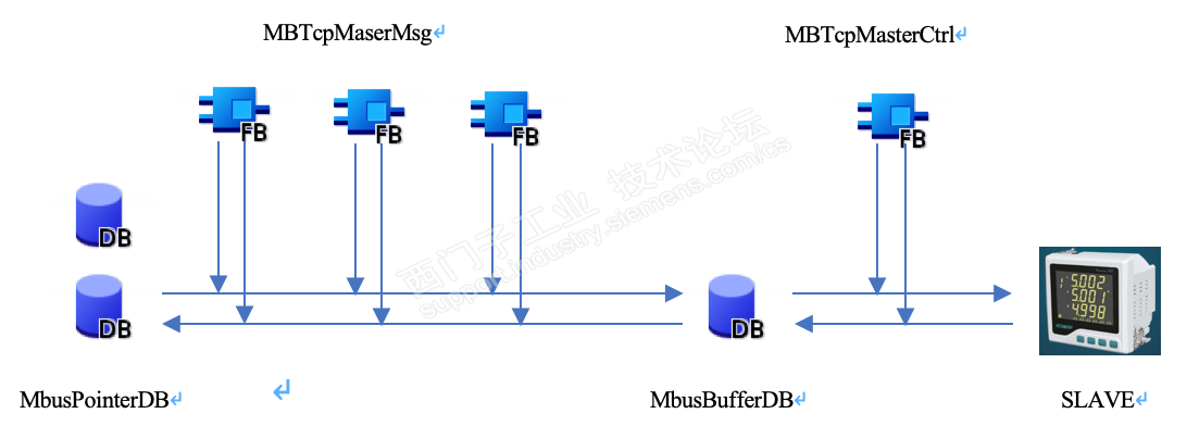 MbusBufferDB 缓冲区数据块是一个400(不可小于400)个字节数据块,可以复制,可改符号,可改绝对地址。 MbusPointerDB 用户数据块用户可自行定义,无要求。 六、 程序注意 例程内有PLC上电初始化脉冲(FirstScanOn),见OB1最下方程序及OB100。指令使用此脉冲初始化。指令内使用符号寻址,所以绝对地址可更改。 其它指令的符号地址和绝对地址都可更改。 当功能号为5时,用户数据块的字节地址的第0位有效。 当功能号为1,2,15时,用户数据块的字节地址的从第0位开始有效。 程序无法在仿真器内工作。 七、 程序高级应用 1. 当有多台从站执行相同操作时,如读取相同数据寄存器。这时可将指令的完成位连接到读写请求位,将从站地址和用户数据块字节号做成变量,使用完成位改变这两个变量,就可以实现单指令轮询多主站。 2. 当用通信控制设备启停等操作时,或多从站时快速刷新单个从站数据时,要求响应时间快一些,而有些程序没有这方面考虑。本程序在应对此方面可以将单一轮询指令的激活位置真,其它指令置假(用上升沿,仅一个扫描即可),这时不管其它指令在什么状态都会将连接使用权让出,优先让激活的指令运行。 八、 不足之处 这里共享出所有已经编好的例程,由于硬件有限,只有在winAC和cpu315中经过通信验证,如果网友使用其它通信模块有问题,我们会根据问题完善程序。通信程序为全功能24天运行版,24天后可对PLC进行清除复位,程序继续可用。如项目需要无限时版,指令属性内有联系方式。