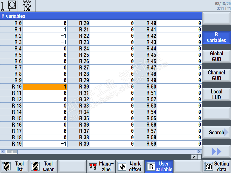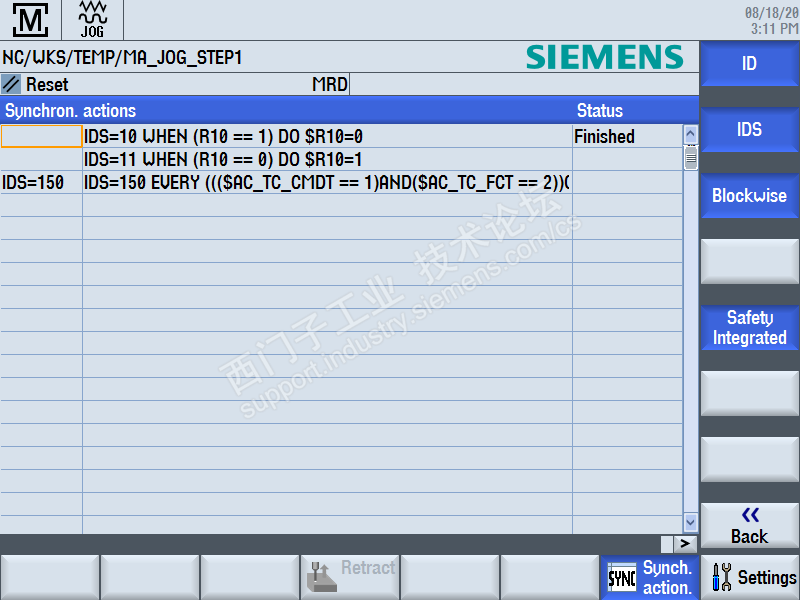 IDS=98 WHEN (TIMER_RESET == 1) DO TIMER_RESET = 0 IDS=99 WHEN (TIMER_RESET == 0) DO TIMER_RESET = 1 IDS开机执行一次后一直生效。when条件成立后只执行一次,完成后不管条件是否变化不再执行。同一周期静态同步动作执行顺序是IDS号从小到大而非程序顺序。多个IDS同时满足条件给同一变量赋值时,Ids从小到大执行,变量值由IDS号大的语句决定。老外逻辑开机TIMER_RESET=1( $A_PLCSIOUT[2]应该不可能开机是1 ),IDS=10/11顺序执行最后结果不会变化。开机TIMER_RESET=0先执行IDS=11,下一周期执行IDS=10,产生唯一一个周期的上升沿。 你的实验: 1.每次按复位键,R10的值会交替由0变1,或由1变0,是由于你设了md20108中 Reset执行事件子程序而非开机执行事件子程序,所以when每次Reset会执行一次。 2.为什么你的实验每次只有其中一个IDS执行呢? 因为条件中使用格式r10只会执行程序时检检测/锁定r10状态,要实时检测r10需要写成同步动作$r[10]格式。 |