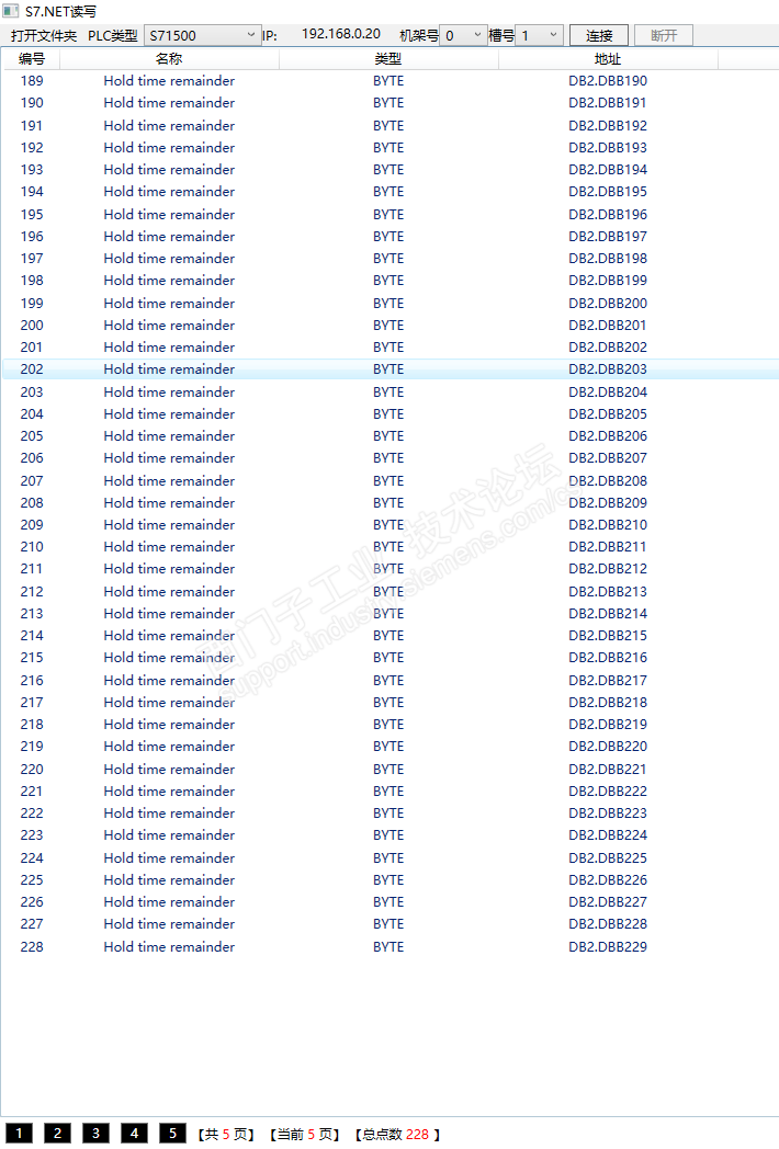 相对于前两个版本都不支持实时刷新,这个版本支持实时刷新但不支持动态添加变量了 1. 应用程序引用的是S7.netplus V0.6版本的dll 支持200smart、1200、1500、300、400 2. 支持基本的数据类型监控:bool、byte、int、word、dint、dword、real 3. 支持分页,因为我的屏幕是1080P的一页监控47个变量刚好,在不出现下滑栏的情况下理论最多可以监控47*55个变量,当然也支持一页大于47个变量,这时就会出现下滑栏,所以还是根据需求选择 4. 支持导入csv文件,导入时也会判断变量类型、地址、和PLC类型是否匹配,导入前请先选择好PLC类型 5. 连接成功后支持变量修改,修改时会判断输入的值是否在所对应的数据类型的值的最大最小值范围内 6. 变量实时刷新,不显示的页面变量不会刷新 csv格式如下 分享下源码,exe文件在bin目录下