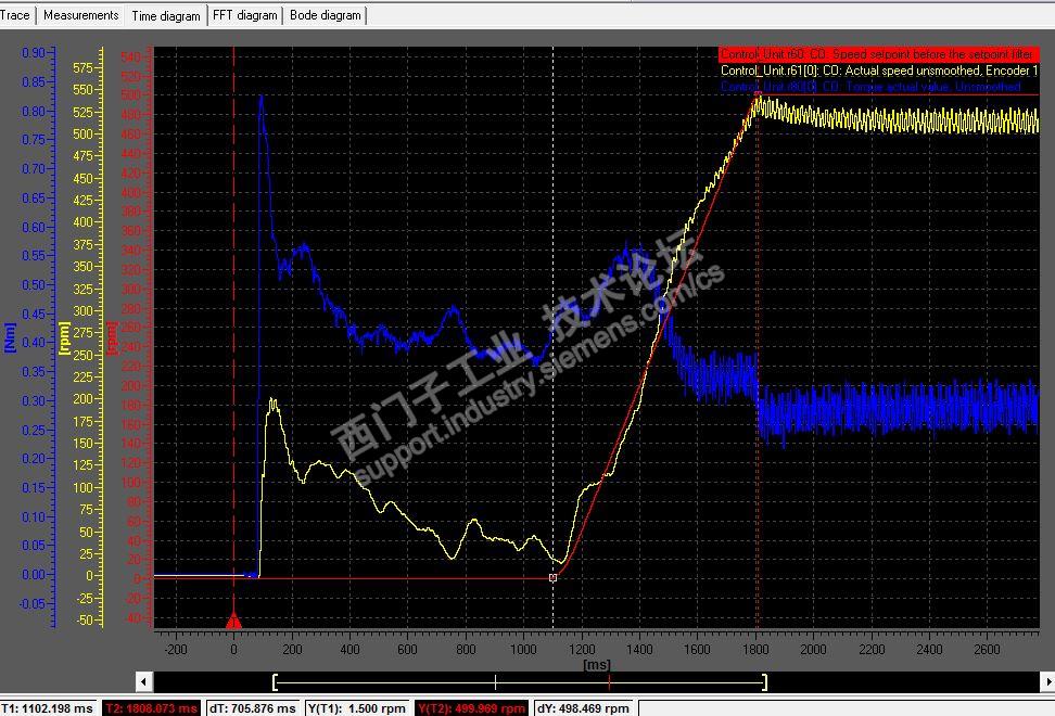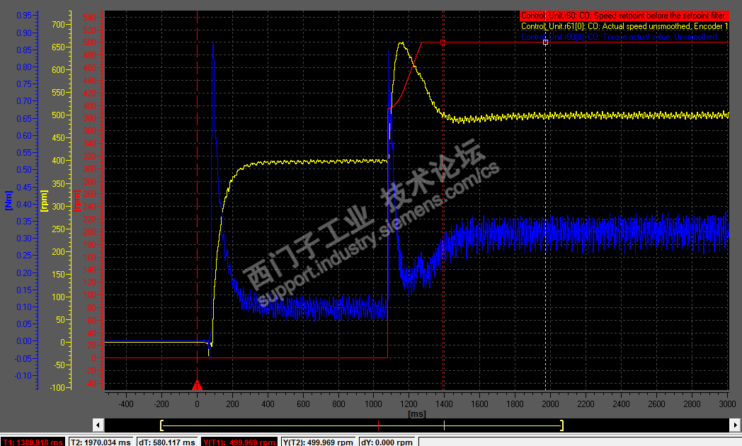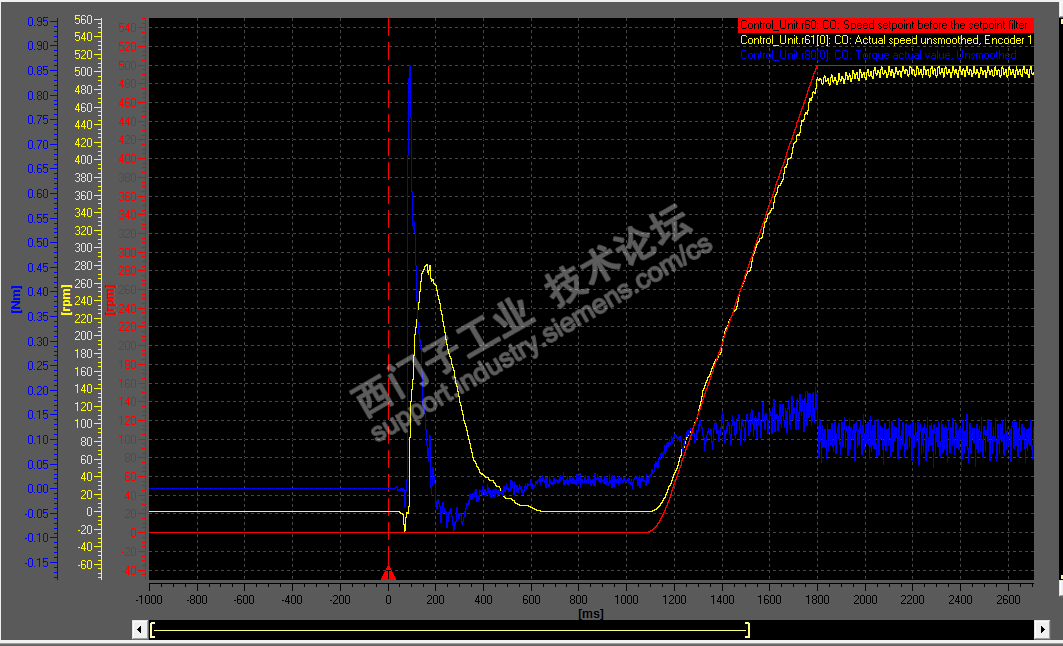 由此图可以看出,75ms(电机励磁时间)后电机开始输出0.85Nm转矩。由于此电机并无实际抱闸,电机转速r61开始增加到约290rpm,输出转矩很快下降到0.33Nm,转速/转矩达到一个平衡,但此时r60依然为0;再过1000ms(所设抱闸打开时间)后,r60沿转速斜坡曲线进行增加,实际转速r61也跟随着增加到500rpm。