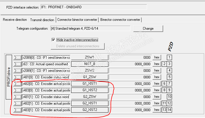 主题:S120如何直接读取位置环编码器值 S120矢量控制 P1300=21 速度编码器为增量型直接接在电机模块的SUB-D接口上,位置编码器为绝对值型通过SM30模块读取,starter中只组了速度环,想直接从变频器中把位置编码器直接读取到PLC,然后用FB285进行速度给定,组态方式如图,请问这种方式是否可行,然后为什么R482中读不到位置数据,谢谢大侠们 |