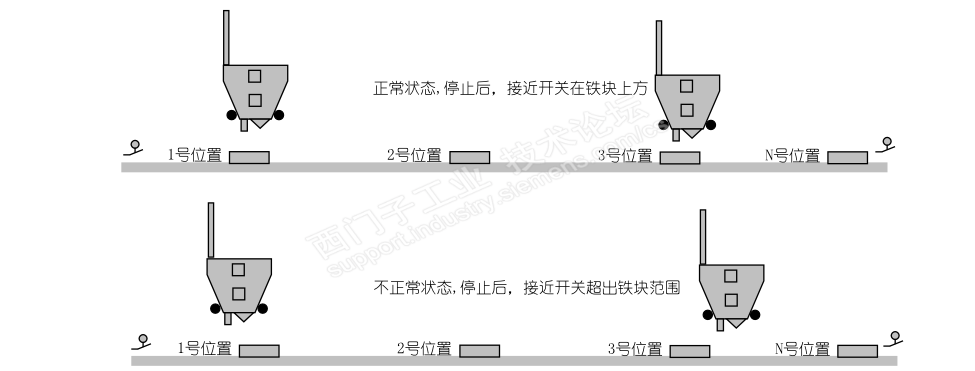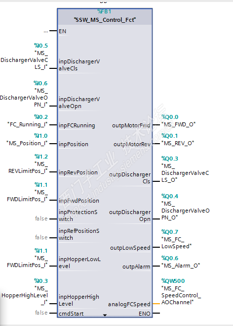 这是一个很简单的单机应用系统,采用S7-1200系列PLC进行控制,应用场景见下图 黄色部分为此单机系统控制范围,缓存斗之前由整个工厂控制系统负责(S7-1500),单机控制系统通过Profinet智能设备方式与工厂控制系统进行通信。 简单介绍下工作步骤 1:工厂控制系统负责往缓存斗里放料,缓存斗下有个卸料闸门,打开闸门往移动料斗里放料。 2:移动料斗所在的称量位置可能装有称重单元,重量达到设定重量后,移动料斗,开始启动,往目标位置移动(目标位置来自于工厂控制系统PLC)。 3:到达目标位置后,移动料斗停止运行,同时打开放料闸门,当移动料斗下料位感应不到有物料后,开始关闸门。 4:闸门关到位后,移动料斗开始返回称量位置。 5:在不同的工厂称量位置可以是1...N中任意位置。 好简单的控制要求啊,就是一台电机和一台闸门的控制吗。老规矩了解控制要求后开始程序设计吧。 整个程序结构如下图 系统的IO点 程序架构定好了,开始每个软件模块编写吧,最重要的当然是移动料斗控制主程序了。考虑到之前客户供应商的控制程序出现过,某些信号失效的移动料斗一直往一个方向移动直到“撞墙”了电机还在工作的情况,所以,在硬件上,我们将客户原来系统中的用来保护用的起点终点漫反射开关更换成行程开关,当移动料斗接触到形成开关后,直接断开系统主电源,强制保护。 毛坯版的程序设计思路很简单 前面介绍过控制步骤了,这里只写一点毛坯版的移动料斗定位的程序思路。 1:移动料斗 根据目标位置 判断运动方向,同时开始检测定位计数开关,每次经过一个位置时,计数加1或者减1,实际位置和目标位置只相差一个位置时,系统减速。 2:当实际位置等于目标位置时停止,开始放料。 3:放料完成,关闸门,开始返回,同时系统开始计数,当实际位置和称量位置相等,移动料斗停止运行,一个工作循环结束。 按照上面的毛坯版程序进行调试后,出现了很多异常情况,不得不对自己的程序进行“精装修”了。 下面就调试遇到的主要问题,来说明“精装修”过程吧 1:移动料斗定位出错 情况1:移动料斗在往目标位置运动或者返回称量位置时 ,计数用的接近开关,可能超出了定位铁块,见下图; 毛坯版程序,电机刚启动的时候就监视计数,所以这种情况下,会导致定位出错。 解决方案:增加定位计数延时时间。 找到问题就装修吧,加个定时器,每次移动料斗启动后,延时一定时间开始监控计数(时间必须可调啊)。改完,下载,效果还是挺好的,定位出错的情况大大减少了。 情况2:移动料斗在移动过程中,驱动变频突然跳闸,同时,定位开关离定位铁块很近的情况 虽然定位出错的情况大大减少了,但是,在使用过程中还是会出现定位出错情况,经过观察,发现这种分析下程序推测可能原因就是,自己在程序里面加了启动延时,但是这延时条件不合适。 解决方案:再次装修,更改延时启动条件,仅在称量位置启动和目标位置返回时,启动计数延时; 情况3:某个位置的定位铁块安装位置不合适,有时定位开关经过时感应不到; 解决方案:增加定位计数信号超时时间。小车在移动过程中,从一个位置到另外一个位置的时间是固定的,因此,设定一个定位开关检测监控时间(时间可调)当超出这个时间后,没有检测到定位信号,系统故障,停止驱动电机,同时发出报警。 最极端的就是定位开关坏了,这种情况在客户前供应商的系统中出现过,偏偏起点和终点的保护开关,采用的是 漫反射广电开关,同时那个漫反射开关也失效了,导致了,移动料斗在不断地“撞墙“. 情况4:移动料斗在经过一个位置时,料斗会抖动,导致定位开关感应到多个定位信号(主要发生2根导轨连接处) 解决方案:增加定位计数信号屏蔽时间。移动料斗在经过一个位置后,不可能短时间内,就到达下一个位置,因此每次检测到一个位置后(DI的信号滤波在CPU硬件设置里面设置为10ms),在设定时间内多次检测到信号,系统不计数。 2:料斗返回时,残料过多 多次发现,移动料斗返回称量位置时,残料过多的情况。经过观察发现,当放料闸门在放料时,由于传感器精度以及传感器选型原因,明明料斗里面还有很多料,但是,料位传感器提示料斗已空。 解决方案:设定最小放料时间(时间可调),在最小放料时间完成后,同时,料位传感器提示料斗已空,料斗才开始关闸门返回称量位置。 经过了多次“装修”,程序总算稳定运行了!期间还对定时器的应用进行更改过以适配客户一些低固件版本的PLC。 附件中是移动料斗控制程序,因为本人偏爱文本编程,同时公司目前只使用STL和SCL,所以 ,S7-1200中程序是SCL编写的。