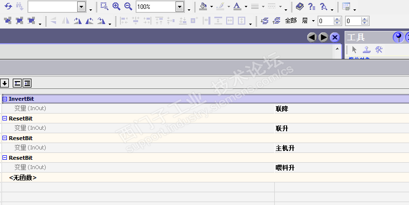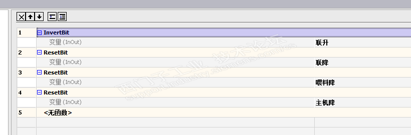 主题:【软件编程】从一次惊吓的操作中得到的教训 这是一个关于smart700ie v3触摸屏与LOGO!的控制互锁的故事分享。 从smart700ie v3触摸屏的问世开始,我就一直在用,对于这款屏的质量一直很有信心。主要还是它能与LOGO!通过以太网协议连接。 在某次使用时,因为按键设计得太小,一个手指突然同时按压了正转和反转两个按键,顿时吓出一身冷汗,好在LOGO!的程序中做了互锁。 自从这次事件之后,得到了一个教训,就是在触摸屏的程序中,能做互锁的尽量也做上,特别是一些M点控制的输出点位,程序中未必方便做互锁,那就一定要在触摸屏中做了。 如下图,一台挤出机的点动控制程序,包含联机(主机喂料同步)速升、联机(主机喂料同步)速降,主机速升、主机速降,喂料速升、喂料速降,如果做互锁,需要用到不少的与功能块,程序显得太繁琐,考虑再三,决定从触摸屏的按键来时间互锁。 控制功能如图: 增加互锁后的触摸屏程序举例 1、联机升速 2、联机降速 触屏中,在按下联机升速按键时,通过位操作中的resetbit命令将所有降速的按键都设置为复位状态,这样就避免了同时按到两个按键时出现不可控的意外。 同理,在按下联机降速按键时,通过resetbit命令将所有升速的按键都设置为复位状态,这样就避免了同时按到两个按键时出现不可控的意外。 这只是其中的两个例子,在其他部分中,只要能加互锁保护的,我现在都是习惯性的添加上,以防万一。 从此以后,再不用为同时误按两个相反的功能键而提心吊胆了。