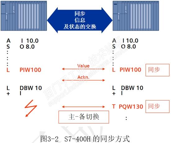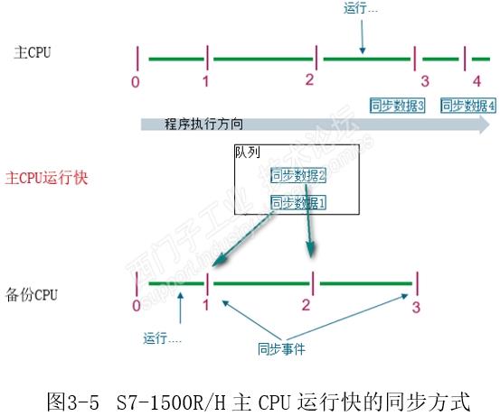 第三章SIMATIC S7-1500 R/H 同步原理 冗余系统至少有两个相同的设备例如CPU,用于增加系统的可用性。两个CPU中间的数据同步也是非常重要的,否则在主-备CPU切换的过程中会产生数据的抖动,从而对设备造成损害,所以冗余系统的无扰切换时非常重要的。 3.1 几种冗余同步的方式 不同品牌的冗余系统同步的方式也是不同的,常见的同步方式如图3-1所示。 第一种方式为周期同步,这种方式比较简单,由于两个CPU执行速度不同,一个周期内可能会产生数据的偏差,在这个偏差还没有进行同步时主-备CPU进行切换,输出的数据可能发生抖动。 第二种方式为时间同步,是在第一种方式下进行再优化,尽量减少主-备CPU进行切换时的数据偏差。只是减少出现偏差的概率,但是还是会出现。 第三种方式为命令同步,不管指令是否会产生数据的偏差都进行同步,这样的好处是主-备CPU无扰切换,缺点是同步占用大量的CPU资源,降低了CPU的性能。 3.2 S7-400H的同步方式 介绍S7-1500R/H系统为什么还要介绍S7-400H的同步原理,因为S7-1500R/H是在S7-400H基础上再次进行了优化,回顾过去可以更清楚S7-1500R/H的工作原理。两者的同步原理仍然是相同,都是采用了事件同步的机制,即凡是可能产生数据偏差的事件都需要同步,例如: ● 直接访问 I/O 设备 ● 中断循环程序执行的事件 ● 更新用户时间,例如 S7 定时器 ● 更新过程映像 ● 通过通信功能更改数据 ● 访问不同的 CPU 上可能不同的数据,例如当前时间、系统时间或运行系统消息 同步原理如图3-2。L PIW100指令为立即访问输入信息即立即读(没有经过过程影像区,不能保证数据的一致性),可能会造成数据的偏差,执行指令后进行同步,同步完成后执行下一条指令。 S7-400H数据偏差的调整是同步,即有数据偏差立即同步,同步完成后再执行下一条指令,事件同步的执行与程序的执行的同步的,如图3-3所示。 从图3-3中可以看到,数据偏差调整与程序运行是同步的,并且是双向的,例如,一个I/O站点如果只连接备用CPU(网线中断),I/O的数据可以从备用CPU通过同步光纤传递到主CPU中,此外程序如果下载到备用CPU,也可以同步到主CPU中。同步调整数据偏差的方式除了造成CPU的运行负荷外,同步的数据也会比较大,这也是为什么在S7-400H的使用时不建议使用外设地址即PIWXX或者PQWXX、S5定时器和计数器等方式。 3.3 S7-1500R/H的同步方式 S7-1500R/H同样采用事件同步的方式,但是数据偏差的调整是异步的,即同步事件与CPU的运行是异步的。此外同步的方向是单向的(除通信以外),例如,一个I/O站点如果只连接备用CPU(网线中断),I/O的数据不能从备用CPU通过同步光纤传递到主CPU中(S7-1500R通信线中断就不能运行在冗余模式下)、程序的下载只能通过主CPU等,异步偏差数据调整方式如图3-4所示。 与同步调整数据偏差的方式不同,异步调整方式在备用CPU中使用一个缓存区存储主CPU同步的数据,当然主-备CPU不固定,哪一个CPU先启动哪一个就是主CPU,所以每一个CPU中都有缓存区。异步调整方式分为两种,第一种情况,主CPU运行的快,如图3-5所示。 主CPU 比备用CPU块的情况下,例如HMI与备用CPU进行通信,导致备用CPU的运行变慢,经过同步事件时,例如一个读取外设输入指令,主CPU将发送需要同步的数据到备用CPU的缓存区中,备用CPU运行到该同步点时提取缓冲区中的同步数据并清除该数据。这样将保证CPU一直快速运行,减少CPU同步的负荷。如果主-备相差过大,系统将自动补偿。 第二种情况,主CPU运行的慢,如图3-6所示。 使用系统IP通信方式,大部分是与主CPU进行通信),备用CPU经过同步事件点时,等待主CPU运行到该点,然后被主CPU同步,最后备用CPU再执行程序。