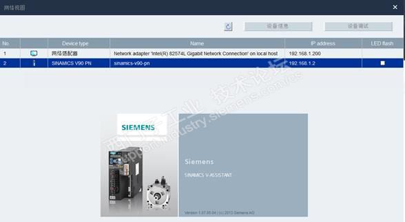 3. 勾选“LED flash” ,可以使该设备BOP 面板上的 “RDY” 灯以2Hz的频率闪烁,用来确定扫描出的设备与实际设备的对应关系。 图2-4 勾选“LED flash” 4. 选择需要调试的V90 PN 设备,之后点击“设备调试”按钮,可以进入调试画面 图2-5 设备调试 在图2-6画面中进行设备的调试,与之前的V-ASSISTANT 调试软件的使用方法相同。 图2-6 设备调试 2.4 与通过USB 连接的不同之处 通过以太网连接的调试,隐藏了网络配置部分,如图2-7所示,由于此部分的配置在网络视图中进行(见图2-3)。 图2-7 隐藏了网络配置部分 2.5 其他 其他的调试功能,如驱动的配置、参数化、调试及诊断,通过以太网连接与之前通过USB 方式连接的相同。