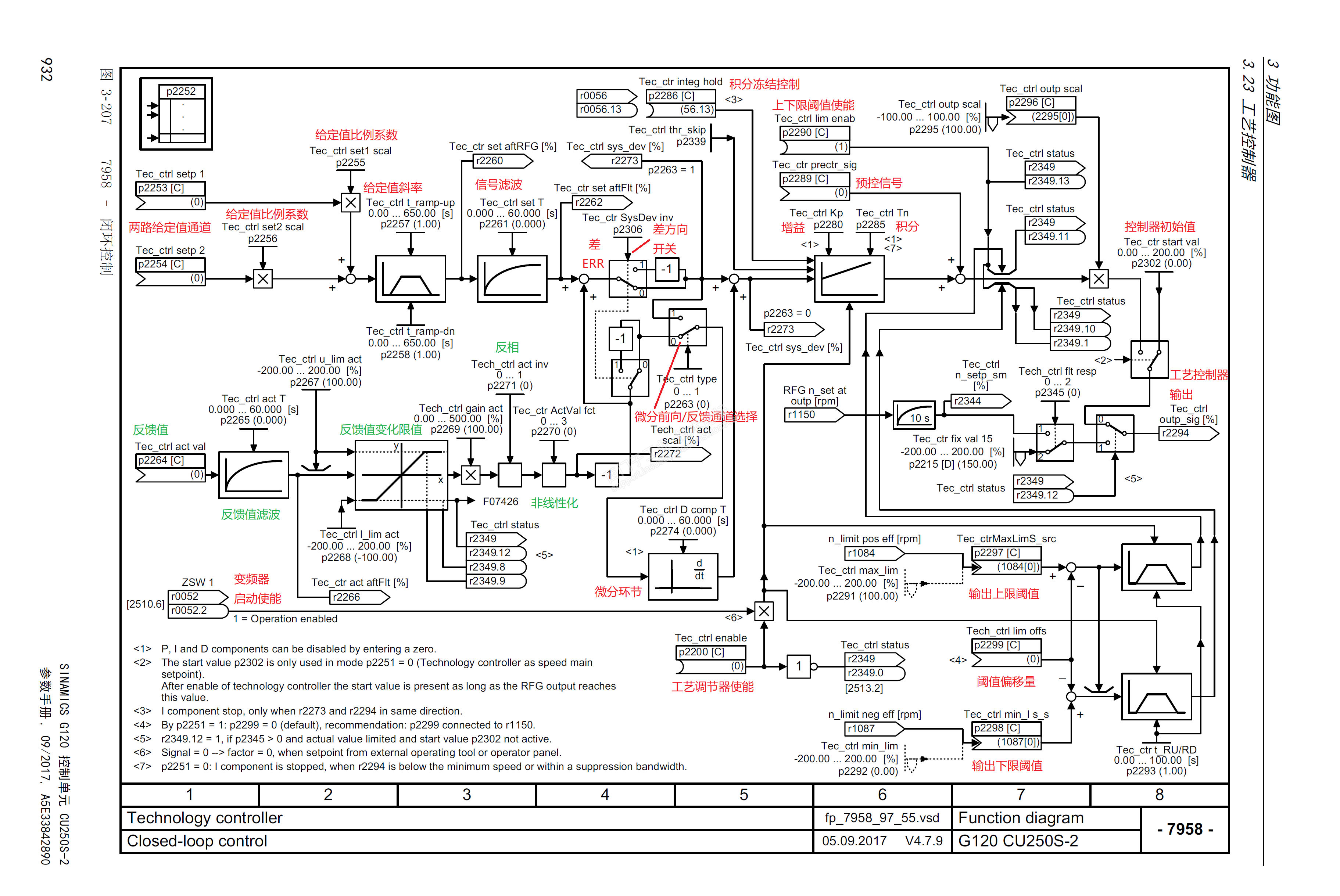 在自动化控制中,我们经常使用PID功能,但是大多数仅使用PI(增益+积分)功能,很少使用微分的功能。 为什么呢? 我试着从时域的角度来解释一下: 先说一下西门子驱动。 在大多数的通用型以上的(非简易的)驱动中,都给了你一套工艺调节器(你用不用,它也在那里!) 它是独立存在的。(你有7台变频器,那就有7套工艺控制器在那里放着。) 这个工艺控制器就是一套完整的PID控制系统。有两路输入、滤波、斜率、对差不同的处理,对微分的通道处理、增益、积分、输出上下限的设置、偏移等等。 你既可以用它做传动系统的调节,也可以做对驱动的微调(加入到主控回路中)。 还可以作为实验观测器,来检查你的控制调节系统的动作! 下面展示的是G120的(S120,从前的MM440/430 都有) 我们可以用它来观察 PID调节器的各元件作用。 如果对此工艺调节器的输入,BiCo到变频器主控系统的对应端,输出不连接任何实际控制对象。那么就能观察到这些元件的动作。 首先,如果驱动使用开环控制,我们知道,电机空载时,转速=设定转速,当突然加载额定负载时,V/f模式下,转速急剧下降,负载不变,该转速稳定在某值不变。 因为,微分仅对差的变化有输出,此时的微分功能输出如下图: 这,这,这微分作用的时间也太短了吧? 好吧,我们将主控改成闭环,加入增益、积分的PI控制。 这时控制系统成为一个无差系统,在积分器的作用下,实际值终将=设定值。 此时,看看微分的作用! 我擦,你、你、你这微分在主控调节恢复到设定值区间,没起好作用呀。不但没有能加快响应,反而是在“拖后腿”! 所以说,书上的 ” 斜率微分负责对变化趋势斜率做预测响应并反映在输出端。“ 不一定是好事儿。 这就是前向通道通常不使用微分的原因。(所以在矢量控制中,干脆取消了这个微分环节。)