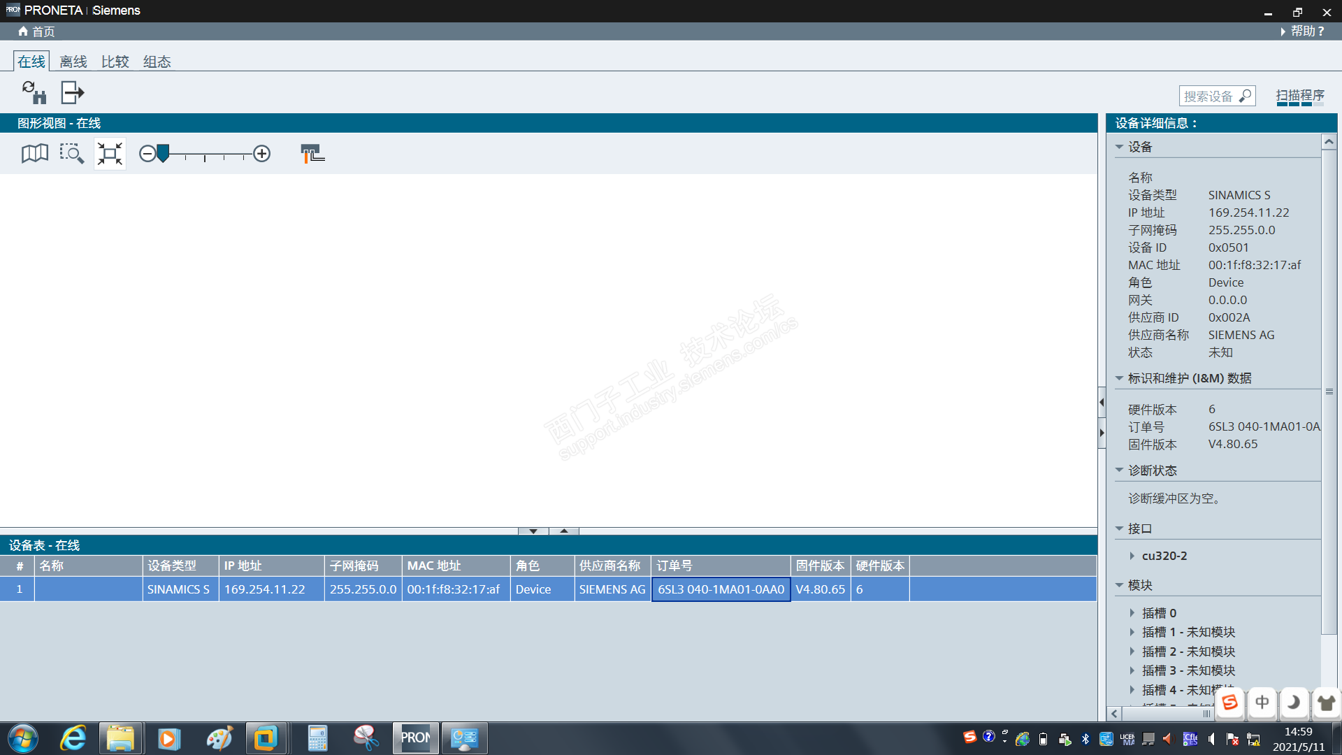 由于不知道这端口的网段,我用PRONETA(这个软件蛮好用的,免安装,就是不能看报警信息,我看手册介绍是有点,但是我看诊断缓冲区都是空的)扫描了一下。 地址169.254.11.22。后来看手册知道这个端口X127的地址是固定的,不可修改。