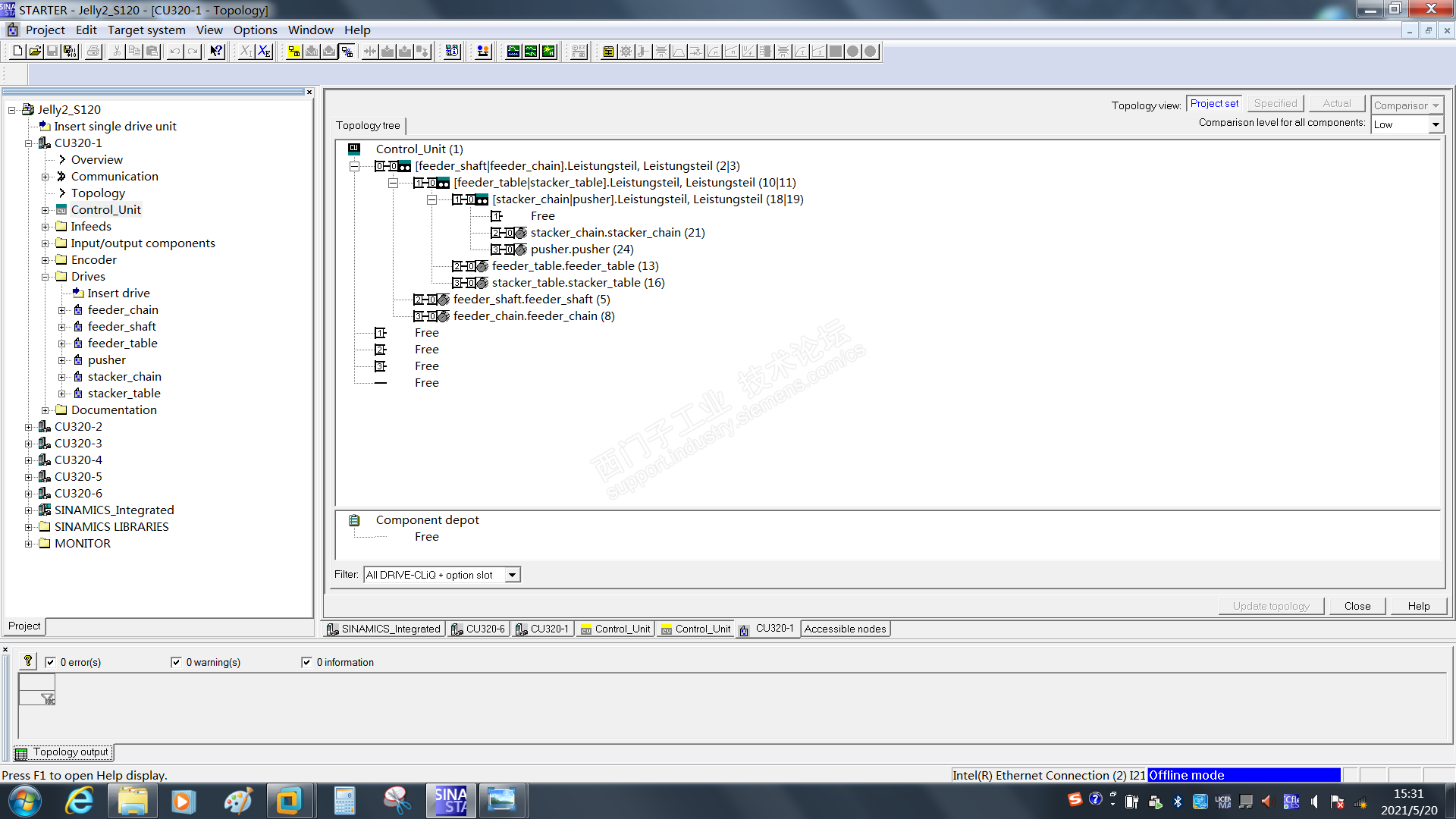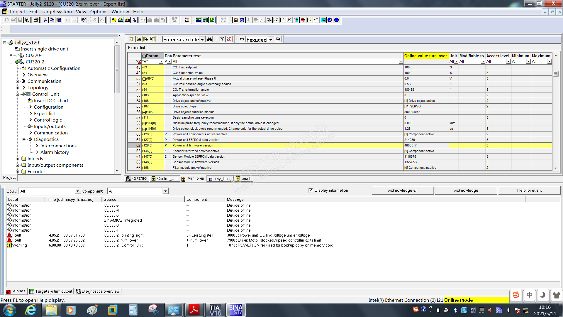 新版本装好后一连就成功了。我怕弄错,一个控制器一个控制器上载的。 这里一个CU320带3个S120,每个S120带1个电机。在拓扑图中可以看到哪两个是一对。 我还看了下故障,故障信息里都没提到驱动器的问题,但确实换了驱动器之后就好了。感觉这里没有Rexroth的厉害。 换上新驱动后提示驱动器固件版本不对,断电重启之后好了。 这个版本问题也是看了帖子之后知道的,S120固件版本会跟随CU320。 http://www.ad.siemens.com.cn/club/bbs/post.aspx?a_id=1305484&b_id=47&s_id=0&num=33 贴子2楼的文档中提到,功率单元并联硬件版本必须一致,厂里有相关设备的,买备件要注意了。