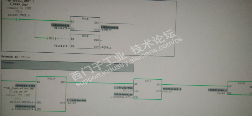 主题:零晨2:00到公司解决环形炉助燃风机G150禁止接通的故障 过程: 事情还是要从5月23日说起,那天环形炉就出现莫名其妙的停炉,由于我手机半夜不知何时没有电了,没有接到电话,其他同事现场折腾了好长时间,炉子总算开起来了,可是第二天中班又莫名其妙的停炉,操作自行复位重新点炉又好了,由5月23~25我们的穿孔机不争气我都折腾了好几天了,没有分身法来解决这台炉子的问题,5月26日穿孔机总算找到了故障原因,总以为可安安稳稳几天了吧,可是到零晨2:00现场维修人员从23:50到零晨2:00问题还没解决,我被睡梦中唤起。 到了公司我了解故障信息: 维修人员告诉我DP总线是好的,就是操作台无法运行变频器,AOP上显示禁止接通,切换到本地可以运行变频器的,变频应该没有问题。 可是没几分钟看到AOP上显示接通就绪,让操作工启动变频器可以运行了,这一夜我没有回去到天亮没有出问题,也不知道是怎么好的。 5月27日炉子变频器没有出问题。 可是5月28日中班18:30变频器又出问题了,我再次赶到现场恢复变频器,没过多久此时看到了PLC闪了一下红色DP报警,变频器又停了,此时维修人员也在检查问我PLC上的DP插头要放在ON上面还是OFF上,我说PLC上一进一出应该在OFF位置,G150上的DP插头要在ON的位置,维修人员让我看怎么PLC上的DP插头怎么在ON的位置,但没有完全在ON的位置,难道在临界位置,由于PLC的DP插头不能插电脑,当时我正在准备用STARTER软件连上G150,干脆就把PLC的DP插头和变频器上DP插头对掉,同时把终端电阻位置重新拨一下。 通信DP线正常后,AOP上还是禁止接通,让操作复位故障,运行变频器又可以工作了。 维修人员前几天出现AOP上还是禁止接通变频器就是不能起动。 我之后看了一下变频器控制程序: 我告诉维修人员禁止接通要看PQW822是不是给了#47F就可以了,PQW822是#47E禁止接通是正常现象,如果PQW822是#47F就不正常了,现在PLC上的那个DP插头放在ON的临界点位置导致通信时好时坏是主要原因。 观察几天后变频没有出现通信中断并停炉。 忙忙碌碌一周时间5天有4 天晚上是扑在公司的,其中一天我是故意去上中班,且设备没有问题的一天,一周加班超过了24个小时(加班没有钱管理层只能调休),是我这么多年还是第一次。 故障总算解决了可以静静了。