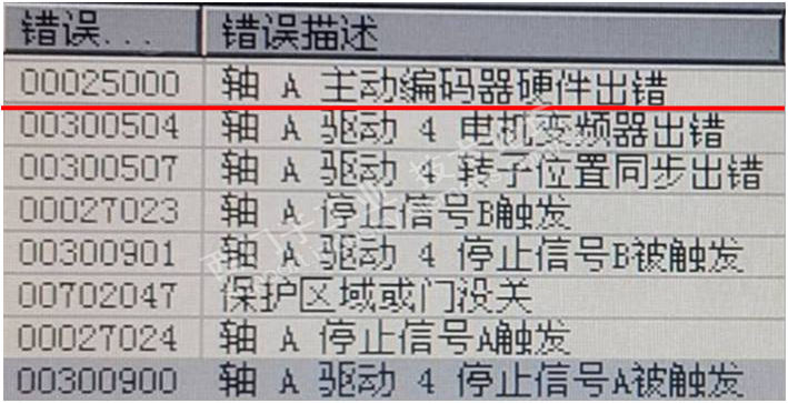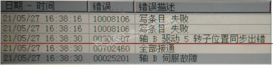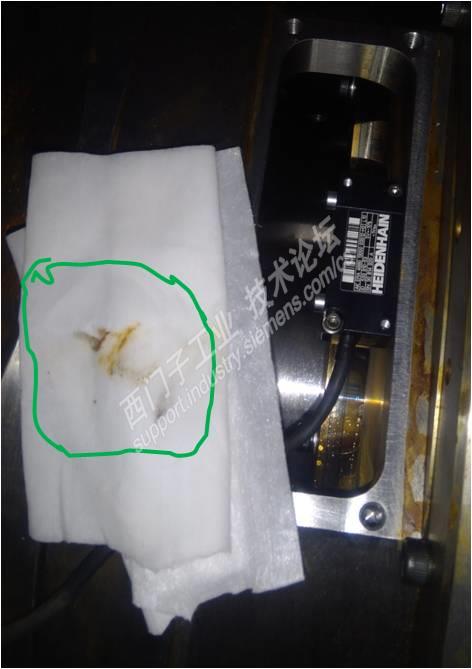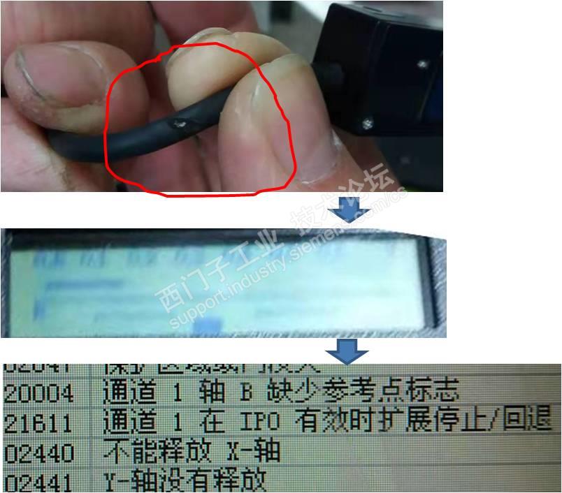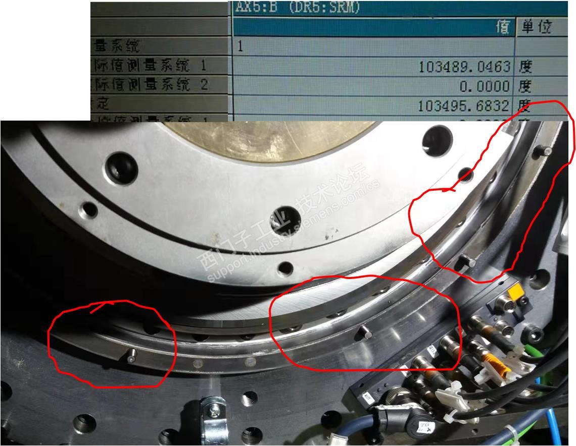 主题:【驱动】1FW6电机+1Vpp光栅尺 一、故障现象 西门子840D切齿机,不能继续运转。 25000:主动编码器硬件出错, 20004:缺少参考点标志。 300507:转子位置同步出错。 二、经验积累 有时更换硬件, 有时清洁处理。 修得快修得好, 员工点赞、领导表扬; 修得慢,全是催促声- 多长时间好,排产急? 修不好,劈头盖脸, 小活不干,大活干不了。 三、五技排故 1、互换电缆验故障 不要看硬件故障,一上手就从复杂角度开始。 1.1 有时无备用电缆,关机重启无25000状态下,徒手弯折电缆或坦克链,查看是否有25000,若有须换件或截短后继续使用,此刻屏蔽很关键。 1.2 国产西门子机床受坦克链弯折、铁屑划伤等影响,常发25000。此时可用绿色电缆替换排除。 1.3 受现场潮湿环境影响,驱动器侧插头氧化,引发断线故障。 2、气吹除尘应干燥 眼睛里有沙子啥感觉,光栅尺相当于机床的眼睛,同仁们是否赞同这一点? 2.1 气源内含水/ 电动机漏水 2.2 密封罩内有积灰 2.3 电缆插头进水/切削液 3、组件洁净无划痕 近视眼带眼镜深有体会吧,镜片雾气能看清红绿灯吗?读数头类似咱们的镜片,划痕、水珠都有致命影响。 3.1 钢带积锈有划痕 4、组装借助PWT18/PWM9 作为机床维修的一名医生,修理中细心、耐心、精心相当关键,手套脏乎乎装轴承,棉纱清理不掉关盖运行,都是不行的。 务必丢弃:安全差,手套脏,动作粗,蒙着干。 强烈推荐:细心操作,精心组装,耐心调试,仪器辅助。 4.1 安装公差得保证 4.2 仪器辅助很关键 读数头预装到位,连接PWT18,徒手轻转目标轴,直至PWT18侧出现黑色长条,微调读数头,使黑色长条处于PWT18的左右框格中间,紧固读数头,再次确认黑色长条状态 5、反馈电缆必拽紧 5.1 钢带磨坏电缆 四、技法总结 平稳运行,技能先行。 五技在手,运维无忧!