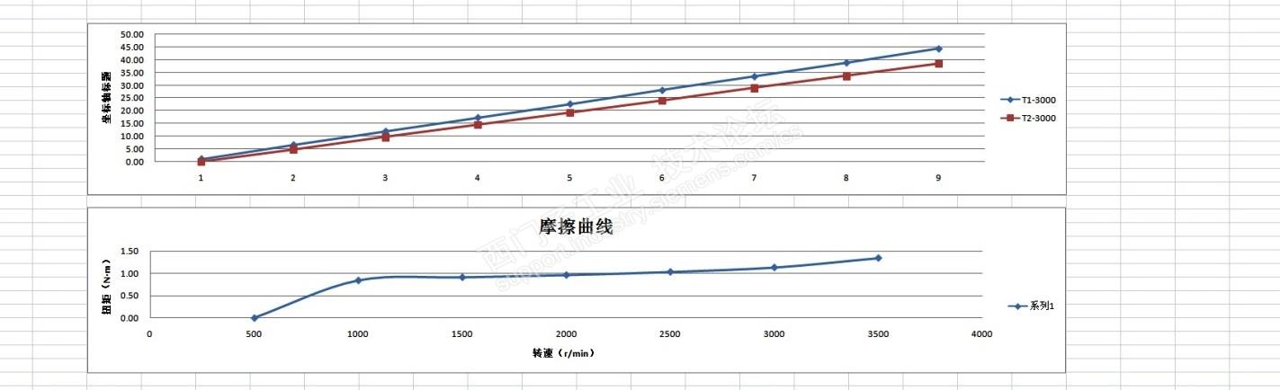 主题:闲来无事,...,研究。 电机对拖试验台。上图左边是一台交流电力测功机,带电机输出轴的转速和扭矩检测传感器 ;右边是一台标准的交流电机。两个电机的功率都是15kW,额定同步转速都是3000rpm,最高转速4000rpm。额定转矩48N.m。 上图为测功机控制柜; 上图为电机的控制柜。 由图示,两套控制系统都是采用的西门子G120系列变频器控制,能耗制动形式的制动功能。 它们在做什么呢?它们在研究(偷笑)。通过在不同转速和不同的输出转矩作用下,那台电机的控制器里参数r80(转矩实际值)与测功机的轴转矩传感器的测试结果比对后,是什么样的关系呢?找到它们的规律性,就可以直接采用一台电机,利用G120的参数r80,通过内部计算修正成和输出轴转矩实测值差不多的数据了。我们要求r80通过修正以后,可以实现与测试实际值误差小于3%-5%。 此实验的目的,就是要通过对拖试验,用测功机标定一台交流电机的控制参数,利用G120的转矩实际值r80,作为输出轴真实转矩监控。实现交流电机没有转矩传感器检测,也能近似实测的输出轴机械特性参数。 某一转速下,不同载荷的曲线。T1为输出轴转矩实测值;T2位r80示值。