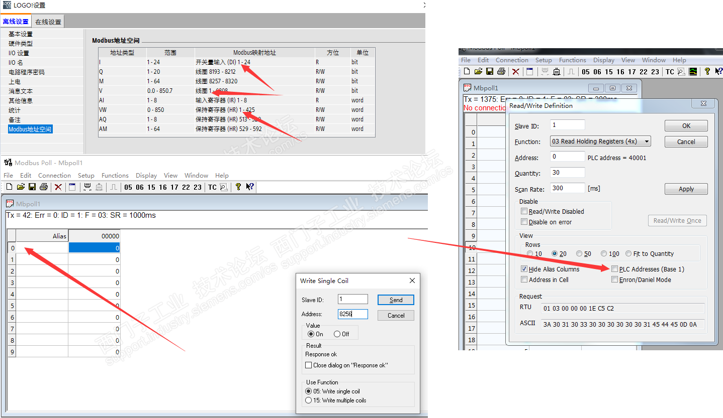主题:回复:在LOGO!中使用Modbus TcpIp进行控制Q和M时映射地址和官方不一样图中不是写得很清楚了么?图里面的是S7通讯表,然后ModbusTCP地址都是从1开始的,所以你用软件测试的寄存器地址是0开始,所以图中的地址要-1才是真正的ModbusTCP数据表地址。 还有官方手册有说了,不同固件版本地址是不同的。所以,不建议用内部定义的地址,还是直接用模块映射通讯表更安逸更适合。 软件Modbus Poll地址问题看看下面这张图能懂不??? |