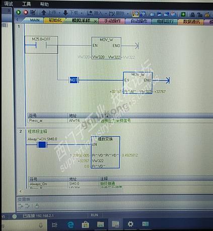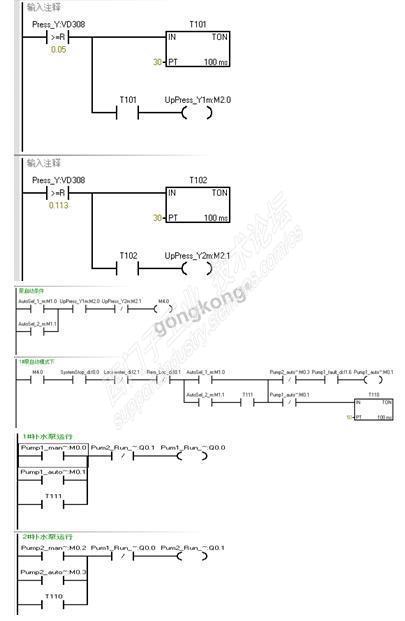 二次现场: 自己不懂工艺,也看不懂管路,即时与朋友沟通费时费事,第二次去现场要求懂工艺的一同前往。上午10:00左右到达,万用表检查了模拟量扩展模块电源,压力变送器电源,都没有问题(朋友设计的模拟量扩展模块电源由独立开关电源提供;压力变送器回路电源由PLC主模块6ES7288-1ST30-0AA0输出的传感器电源提供,二者不是同一个电源。短接了另外一个未用到的模拟量输入通道,问题依然存在,压力采样数据还是很稳定的显示32767。 监测到的压力变送器测量结果如下图2 图2:监控PLC采集的压力数据 打算测量压力变送器输出电流,此时突然发现模拟量模块EM AM03(6ES7 288-3AM03-0AA0)上端盖下竟然是上下两层接线端子,模块2根电源线明显被错误的接到了上层段子。 CPU及模拟量扩展模块如下图3 图3:CPU ST30+EM AM03 将模拟量扩展模块EM AM03电源(L+/M)两根线移到下层端子相应位置(如上图3),监控看到了压力真实数据。至此问题2圆满解决。对于问题1,我提出看法后,搞工艺的也认为要压力在一定范围内才能启动,与我朋友说法一样,我只有哑然接受…… 压力值正常,手动条件下启停调试正常后调试自动。切换开关拨到“自动”位置,主泵不能自行启动,原因还是管网排水后压力突然之间低于设定的0.05MPa,电机不能启动。此时搞工艺的有点“明白”了过来,感觉要做成如我所说的低于低值启动,高于高值停止。让他与我朋友沟通,他们达成一致后我修改了程序。继续调试自动运行,低压自启高压自停,却又带出来一个新问题。 问题3:高压停泵,泵停止后压力会有一个小范围骤降,监测到的压力值又小于了设定的压力高值,而朋友高压停泵逻辑采用了串联压力高值常闭点停线圈输出的方式。这样就出现了停泵——启泵——停泵的不断循环,听见接触器噼里啪啦的吸合关断声,搞工艺的说他感觉我做成恒压调节了(看来人家这位搞工艺的懂自控)。 源程序有关压力控制泵启停的逻辑段如下图4 图4:压力控制泵启停逻辑片段 看源程序,朋友可能也考虑到了会出现问题3,压力值比较后没有马上输出结果去启停泵,而是做了3s的延时处理,但是实际运行中3s时间管网压力上升值不足以抵消掉停泵后压力值突然骤降,还是出现了停-启-停的不断循环。起初考虑加大这个延时时间,测试后感觉不够理想,后来直接将启停泵的压力标志位M2.0/M2.1做成SET/RST形式,这样一旦SET M2.1,就会彻底停泵,等到压力降到低值以下,延时启泵时再将M2.1复位就行。 泵房面积不大,最少有三家供货商调试设备,地面没有处理,到处是垃圾尘土油污,控制箱顶部是唯一比较干净的地方,将笔记本搁在箱顶,高度与我站着基本等高,看一会程序头晕脑胀脖子僵硬。 时间马上到19:00,赶紧收拾战场回家。 又耗了一天。 欣慰的是,发现的问题均已处理好,前期调试算完成了任务,甲方搞联调暂时不会再找我。至于运行以后发现隐性问题,那时朋友已经归来,他的作品还是他出马解决喽!^_^