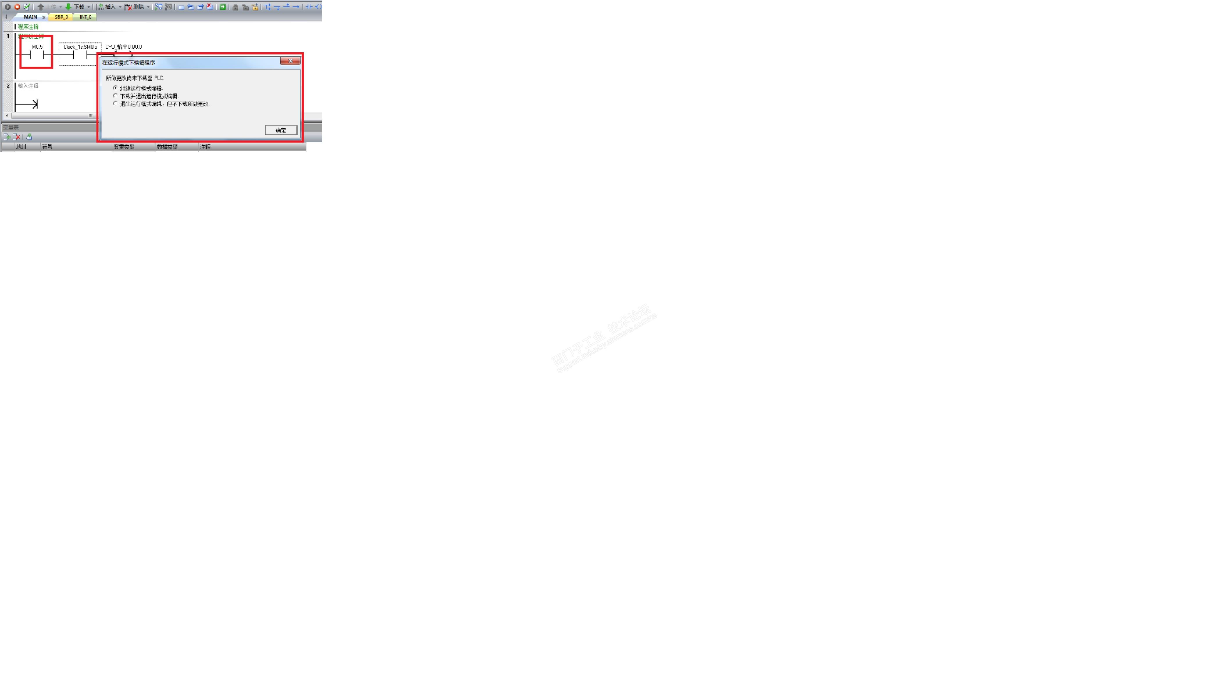 200smart 运行模式编辑并下载方式 一直来,在下载200及(smart)PLC均是在常规默认的状态下,plc处在stop模式下进行的,也没有仔细看过2款软件中的其它下载操作模式。前几天,看到类似的提问说有不在stop模式下,下载用户程序的方式。 刚好手头上有一台200smart 的PLC可以用于测试,在运行中编辑的方式。 1) 创建一个测试项目,编辑一个简单的测试程序: 2) 断开在线,点击“调试”项目下的“运行中编辑”按钮,在弹出的对话窗口中选择“是”,在再次弹出的对话窗口中选择“上传”,图示: 3) 这时,软件编辑区的光标上会跟随一个plc的模型,这个模型就是运行中编辑模式了,你修改M0.1为M0.5后,再次点击“运行中编辑”按钮,这时会弹出3个选项窗口,图示: 4) 下载“下载并退出运行模式编辑”,确定,然后再在线监控,图示: 此次下载,plc并没有进入过stop模式而下载的。所要主要的问题是plc的版本必须高于V2.0,为了不使设备停止运行或者其它对设备和人身存在伤害、危险性的操作,都需要提前预示和充分的评估。假设,我的例子程序中,为了在不停机前提下修改M0.0变为M0.5,使Q0.0始终有秒脉冲输出, M0.5必须在状态图表上提前使能为1,或者其它上位机上使能这些位为1。 |