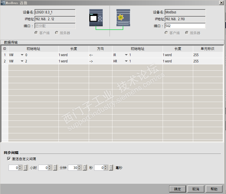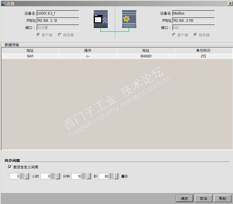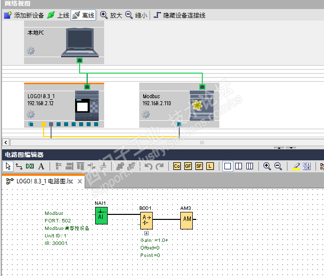 主题:回复:求助logo modbus tcp 从站的通信设置大体上整个流程都没啥问题,只是细节上没考虑到,以前做过测试Modbus客户端没问题的。 1、网络视图里面的端口不要乱连线; 2、Modbus连接 的 单元标识 需要自己测试,很多厂家都是用1,而不是西门子默认的255; 3、用ModbusSlave测试是,读取300001,顺手写回400001很方便测试LOGO!程序、配置是否正确; 这是测试程序 |