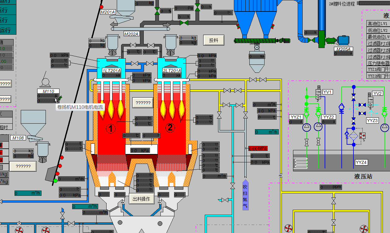 如果在操作画面时想查看某个变量的变化趋势,如果去趋势画面查看要进行翻页,还要选择相应的曲线查询,如果在画面中直接点击输入输出域就能弹出曲线控件是不是就操作更方便了,我看到某个厂家的DCS就可以配置这项功能,于是我就琢磨一下,还真给实现了。 主要思路就是在画面中放一个趋势曲线控件,默认不显示,鼠标点击趋势曲线时,趋势曲线控件移动到鼠标附件,并加载对应的归档变量以及标题等信息,程序中做了判断如果当前IO域对应趋势曲线处于显示状态,再次点击时关闭显示。 下图为编辑模式: 运行模式: 输入输出域脚本如下: #include "apdefap.h" void OnLButtonDown(char* lpszPictureName, char* lpszObjectName, char* lpszPropertyName, UINT nFlags, int x, int y) { #pragma option(mbcs) // WINCC:TAGNAME_SECTION_START // syntax: #define TagNameInAction "DMTagName" // next TagID : 1 // WINCC:TAGNAME_SECTION_END // WINCC:PICNAME_SECTION_START // syntax: #define PicNameInAction "PictureName" // next PicID : 1 // WINCC:PICNAME_SECTION_END int cmpvalue; cmpvalue=strcmp(GetPropChar(lpszPictureName,"Trend","TagName"),"Archive\1TE201A_RT");//判断趋势曲线是否时当前输出域的曲线 if((cmpvalue==0)&&(GetVisible(lpszPictureName,"Trend")==1))//如果趋势曲线是当前曲线,且趋势曲线显示状态为真 SetVisible(lpszPictureName,"Trend",FALSE);//隐藏趋势曲线控件 else { SetVisible(lpszPictureName,"Trend",FALSE);//隐藏趋势曲线控件 SetPropChar(lpszPictureName,"Trend","Name","窑顶温度1TE201A");//设定曲线名称 SetPropChar(lpszPictureName,"Trend","TagName","Archive\1TE201A_RT");//设定归档变量 SetPropChar(lpszPictureName,"Trend","Caption","窑顶温度1TE201A");//设定趋势控件标题 SetPropChar(lpszPictureName,"Trend","Label","1TE201A");//设定曲线标签 SetLeft(lpszPictureName,"Trend",x-GetWidth(lpszPictureName,"Trend")/2);//设定趋势控件x方向显示位置 SetTop(lpszPictureName,"Trend",y+40);//设定趋势控件y方向显示位置 SetVisible(lpszPictureName,"Trend",TRUE);//显示趋势曲线控件 } } |