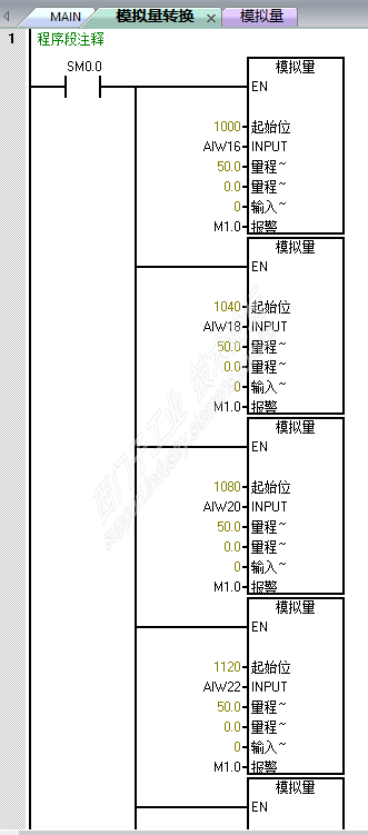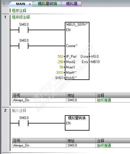 https://www.ad.siemens.com.cn/club/bbs/post.aspx?a_id=1755118&b_id=64&s_id=83&num=10#anch 之前分享了smart中模块化编程的方案,其中第5点提到了这个方案可以与WINCC的结构变量一起使用,这里我将分享一些这个方案。 这个smart与wincc通过讯方式选择的是modbusTCPIP(opc的因为是在opc软件中配置地址,wincc中只需要读取,所有不能使用wincc的结构变量)。 1,smart中需要编写的程序。smart中需要写的编写MODBUS TCP SERVER的程序,这里设计为监控7个温度,温度传感器都是0到10V的,量程都是0到50℃。 moodbus TCP SERVER设置端口号为502(smart做modbus TCP SERVER一个端口号只能被一个客户端访问,如果想被多个访问需要在增加端口。) 模拟量块中程序参考之前分享的。 2,PLC中数据结构展示。 3. wincc中结构变量创建。由于使用modbus TCP通信,结构有一点点不同,具体如下。 4.创建wincc中的MODBUS tcp连接。创建连接后需要修改参数,CPU类型选择984(选择不同CPU对应的数据结构不同,这里以984为例);设置服务器地址,这个就是PLC的IP地址;设置端口号,端口在写PLC程序时设置,默认为502;从站地址不需要修改,默认255,需要勾选转换字类型为16位值。 5.数据连接,创建完结构变量和驱动就可以进行数据连接了。下面是7个温度传感器在PLC中的起始地址与对应的modbus地址。 有了上面的对应表就可以在wincc中创建变量了,具体如下名称按设备名称,数据类型选择之前创建的结构变量类型;选择连接为创建modbus连接地址;地址区域选择4x保持寄存器,地址按照上表。 以上为本次分享的全部内容,下面是plc的程序与wincc的地址表。欢迎大家来交流,看看有没有什么更好的办法。 |