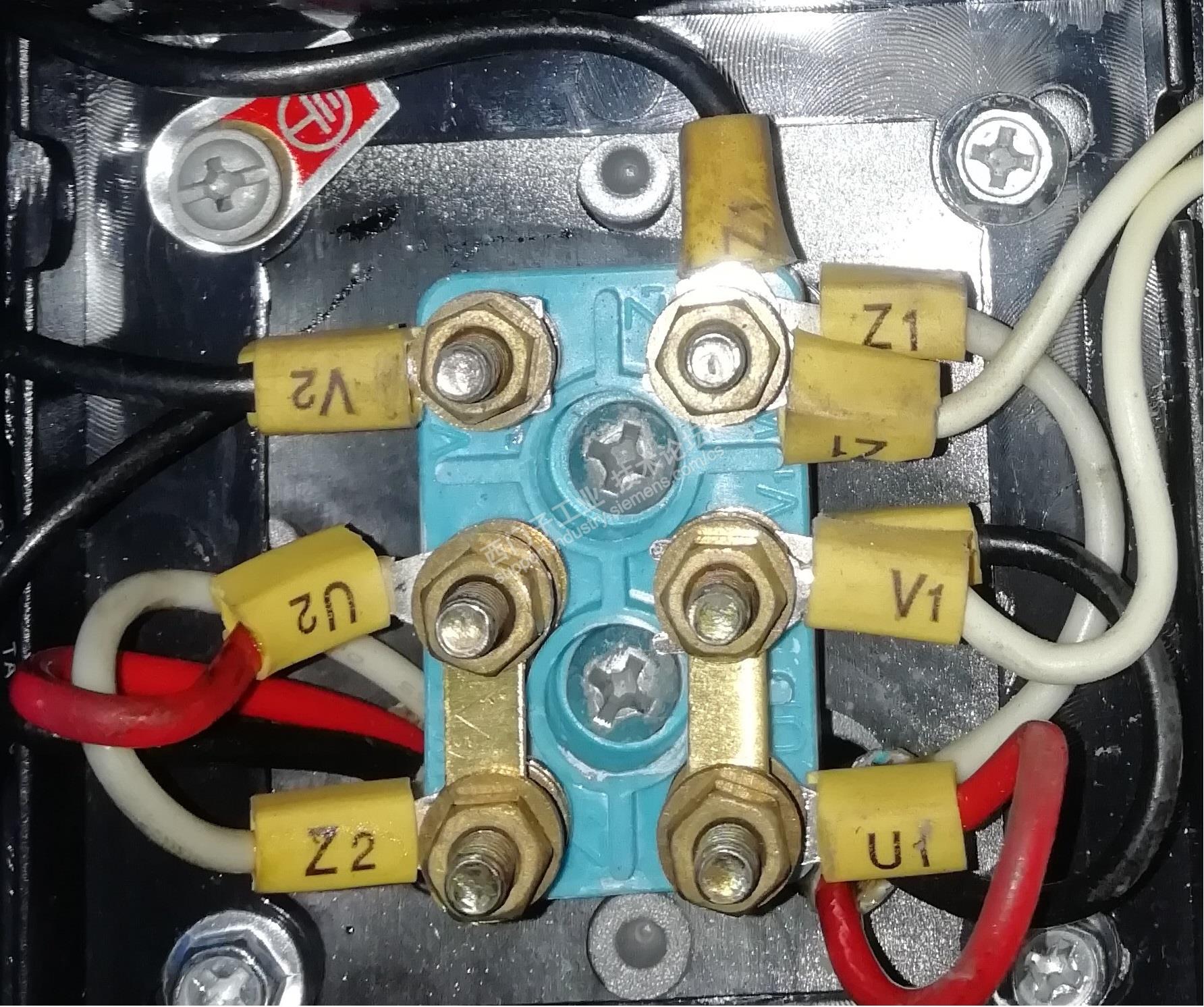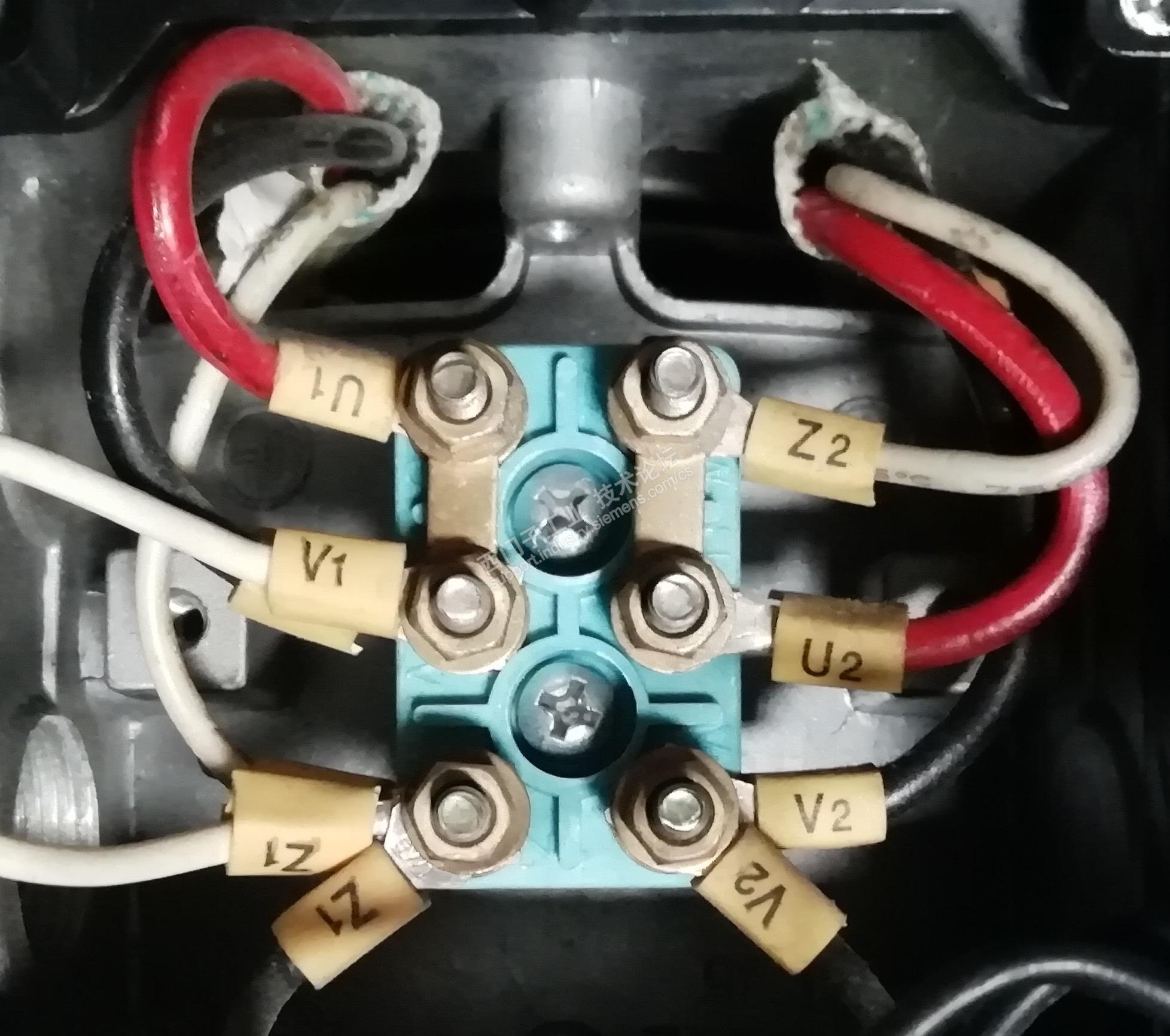 主题:第一次接触双电容单相电机 这样的接线是什么原理? 我知道少许关于单相电机的预备知识,但是就无法理解这里接线端子为什么是这样接线的。 图中是两个电机的接线盒。接线电路是一样的。一张是接线盒上的接线示意图。两个是一样的。 图中可以看见白色线是一个电容和离心开关。黑色线是一个绕组和另一个电容。红色线是另一个绕组。 两个电容的引线都是延伸向同一个方向的。黑色绕组的引线都是延伸向不同的方向的。红色绕组就容易认了。 在两片短接片占用的四个端子中,把短接片接成横向或者纵向并且通入电源,就可以有两个转向。 离心开关是常闭的,作用是转速高了之后断开一些什么。 我是怎么也想不出,要正反转的话是怎么个原理。 我了解到两个电容并联再串联到起动绕组,可以获得较大的起动转矩。随后断开大电容,留小电容在起动绕组支路上,维持工作。从网上找到的图也是这个原理。 我有点怀疑这个厂家接错线。但是老板说用过很多次了,照样接线就可以了。 这是啥回事?诸位。 |