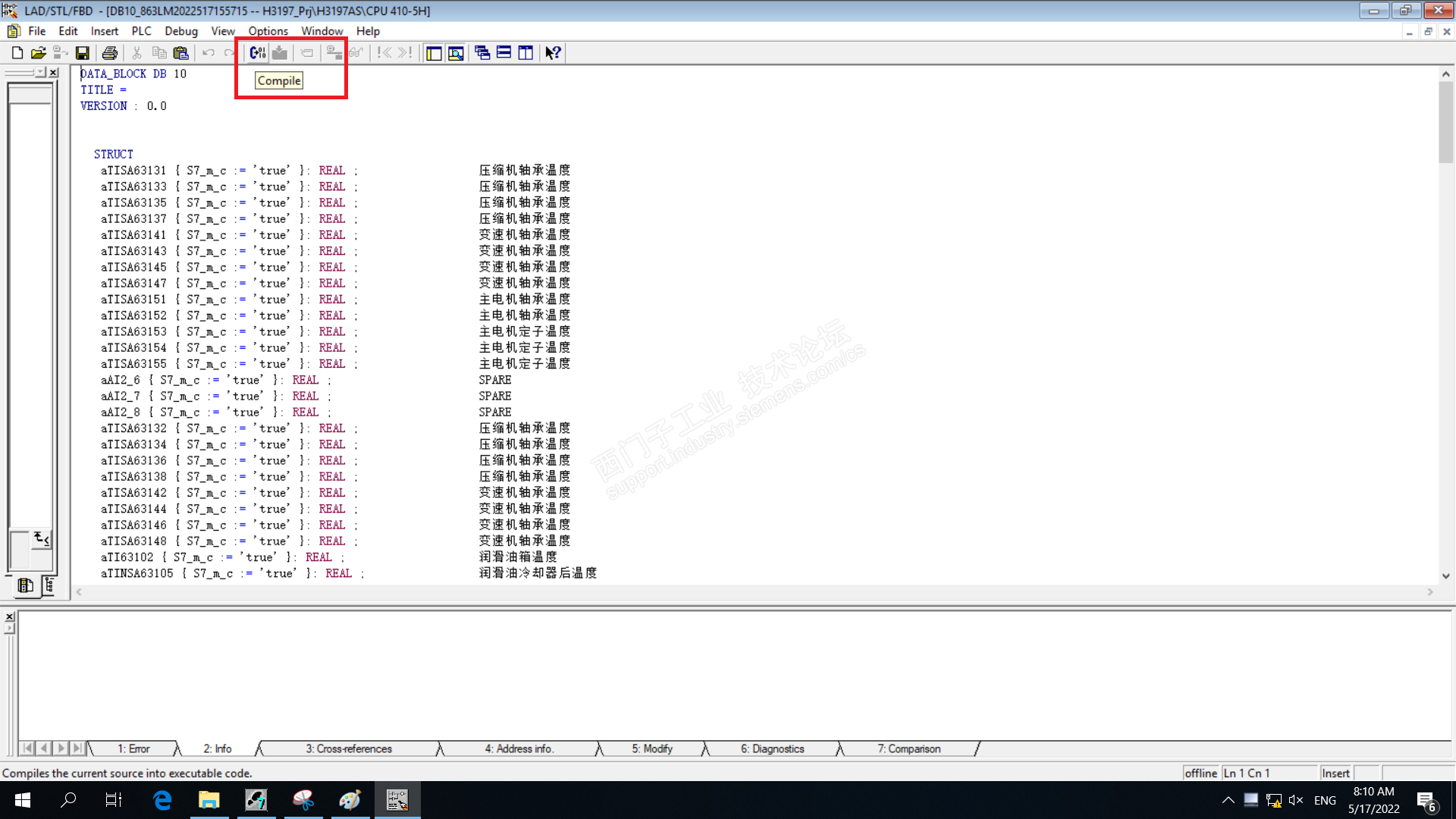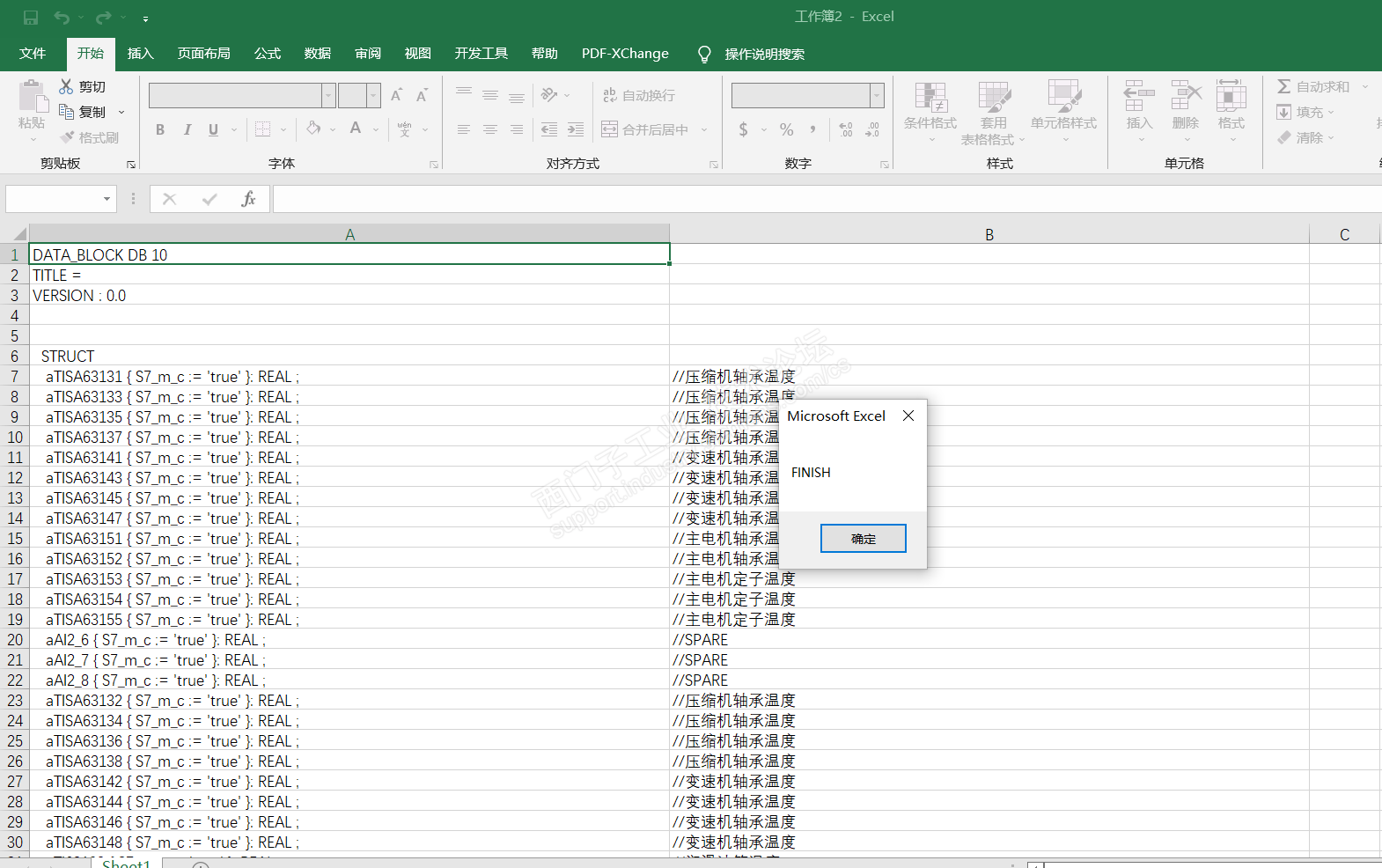 主题:【内行说】VB实现自动化数据库的生成 以PCS7或者Step7为例: 在做工程项目的时候,需要手动建立硬件数据库,以及DB背景数据库,手动建立需要花费大量的时间,而设计点表一般都是以excel的格式下发到编程人员手里。Excel中VB的强大兼容性通过编辑VB脚本,生成dif的硬件文件和awl的DB文件,通过导入源文件的形式,直接生成硬件地址和DB数据块。 把excel中的开发者工具释放出来,应用开发者工具在excel 中插入按钮,并在VB中编辑按钮的脚本,按照不同需求编写了DB10-DB20的脚本,并且编写hardwaresymbol脚本 脚本完成后,点击按钮可以直接生成awl的DB文件。 生成的文件可以直接保存awl文件 硬件文件需要在导入后,在硬件符号里填写硬件对应的地址 而DB10-DB20的awl文件导入后编译可以生成DB块 编译通过后,可以直接在block中 看到对应的DB块 这样数据库直接建立完成,节省了手动建立数据的大部分时间,而且不会出现人为导致错误,极大缩短了项目时间。