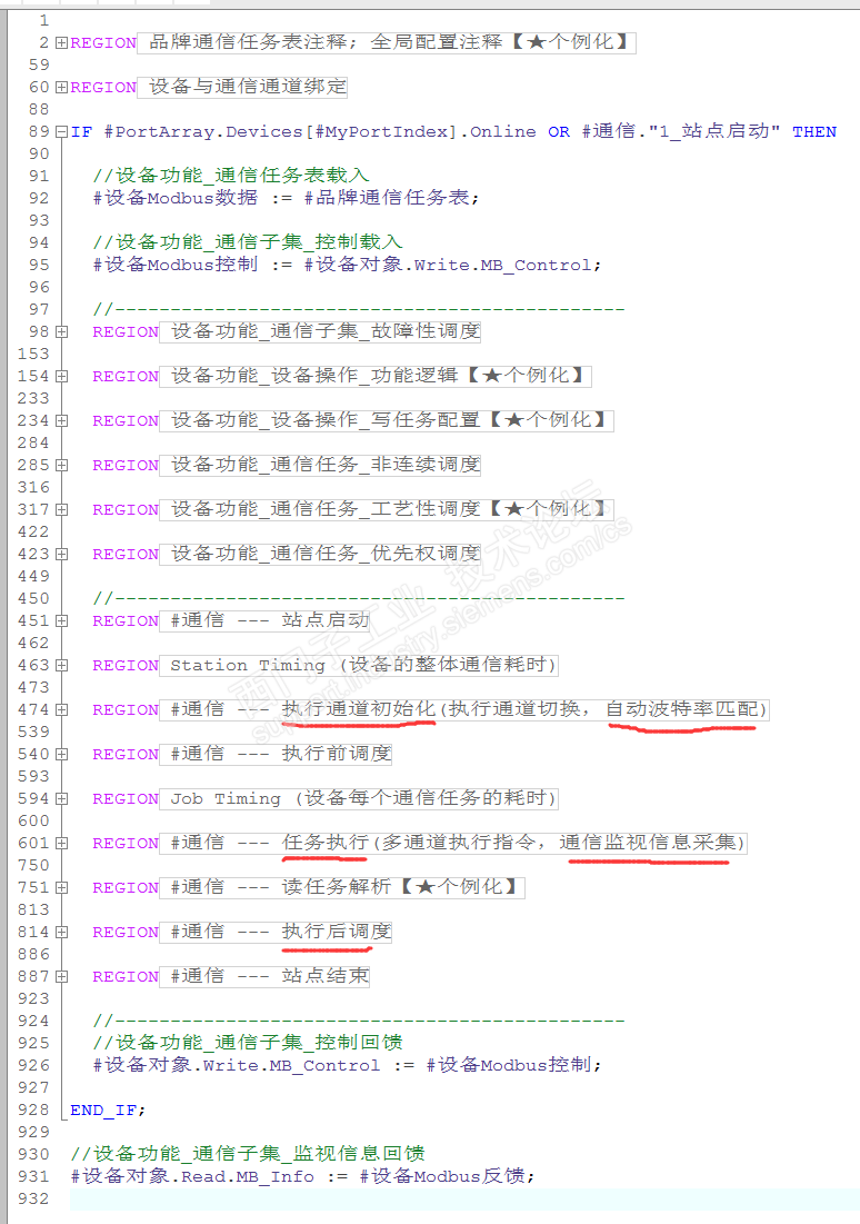 我的每种Modbus设备FB,都具备自动匹配485波特率的功能。 就是在西门子支持的11种波特率中,依次尝试派发任意一个读写任务,并记录下每次的成败。全部波特率遍历尝试结束后,根据成败记录,选择合适的波特率,为该设备的端口进行初始化。 这种自动匹配波特率操作中,多数通信任务必定失败。所以这个期间,必须要禁用设备FB内部的淘汰环节,否则通信无法继续,该设备FB会HMI报警,并自动退出轮询。 这个自动匹配485波特率的功能,是设备FB在执行通道初始化环节中启动的一个子项。 这可以让连接在同一个485端口上的不同MB设备,以不同的速率来工作。 但是,今天遇到了一个设备FB在自动匹配波特率的时候,卡在57600,就不再往下执行了。 上线监控发现,这个设备FB的内部功能,停在了通信部分的执行后调度环节。 进入该环节发现,这个停滞是由于modbus通信中的第三种情形的出现导致的: 既不报Done,也不报Error。该环节中的相应调度子项,没有启动后续执行。所以程序只是空扫描,功能链却断在这里。 而这第三种情形,在通信的任务执行环节中,是有专门的超时处理子项的(3秒超时)。为什么还会出现异常呢?继续回溯原因。 进入该环节发现,在第三种情形处理的子项中,关于自动匹配波特率的执行记录,有一句话忘写了。因为这种卡死情形极少出现在自动匹配中,以前没注意。本来自动匹配485波特率这种事就很少去做,只在更改硬件设定的时候做一次。 把这句代码粘贴上,再次测试自动匹配波特率,ok了。 HMI界面上显示,该设备尝试57600速率的时候,派发的是一个写任务。它的最近一次执行时间是3000毫秒且失败,这正符合上述超时处理的设定。就是这个原因 这个问题的解决只用了几分钟。类似的以前调试遇到过多次,也都很快解决。 关键在于:设备FB内部的诸多环节之间,必须是低耦合组装的,才能容易, 根据问题的性质,精确定位到FB内部的某个环节,该环节中的某个子项元素,而其他无关环节完全不用理睬。对问题溯源,可以按照一步一步的结构必然性,倒推出原因所在位置。否则就要满篇胡乱去找,肯定搞懵,耗时费力。 分享是说明一点:模块化与低耦合,不仅仅是分割成FB或FC。一个块,其内部的数据和逻辑结构的设计,是可以按照场景细节分隔的,这样效率会高。在诊断的时候区别很大。 大家可能注意到:最后一个环节通信子集的监视信息回馈,没有被放进上面大的IF语句中。 这是因为:每一个设备FB,可以单独被控制是否允许参与进入轮询,和对端口通信资源的竞争。即使不允许进入轮询,在该设备的HMI页面上,依然还要动态更新: