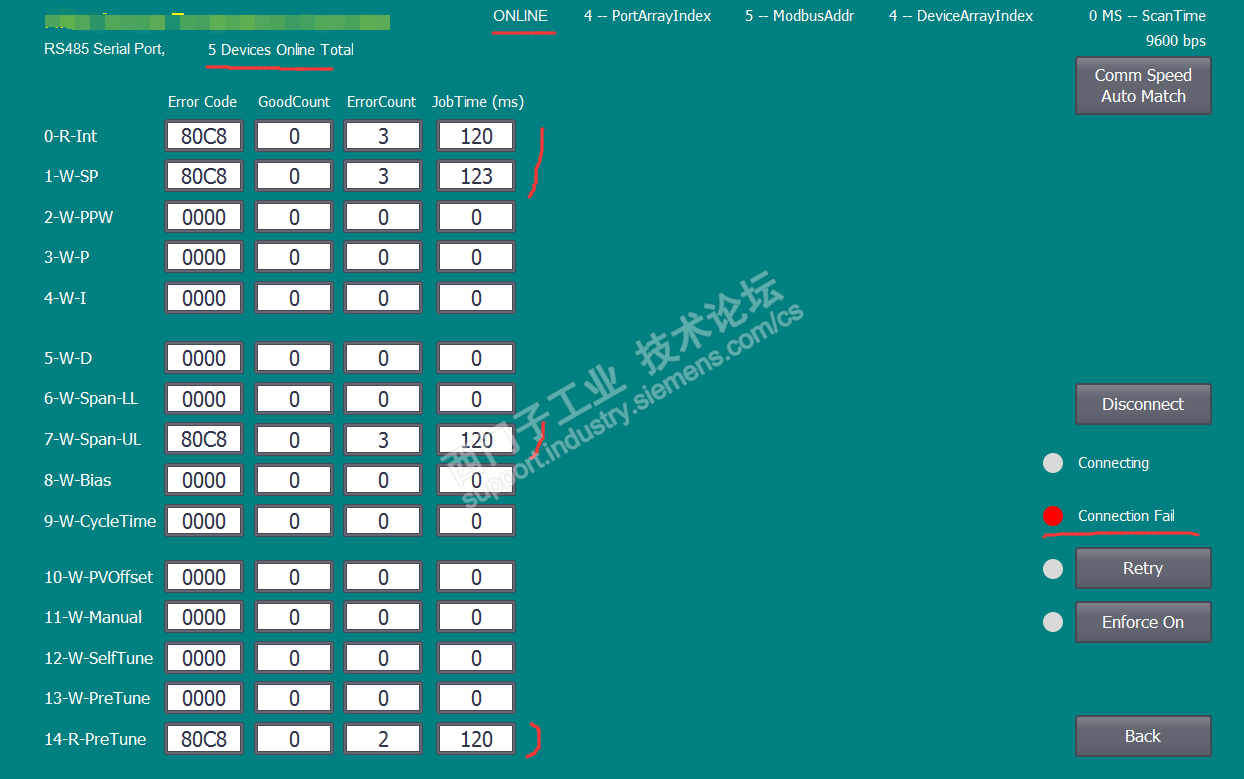 可以在HMI界面上,根据现场接线的实际情况,参数化配置通信通道。效果如下。 一个设备是否被允许参与485轮询,和在轮询中被淘汰,两者不是一回事。 比如:一个485模块,连个5个Modbus设备,可以启用和禁用其中某个设备的上线。被允许上线参与轮询的设备,如果通信质量出现问题,可以被临时淘汰退出轮询。等后来线路质量改善,可以再恢复上线继续参与轮询。 就像商店申请许可,即使拿到许可,依然可以临时关门歇业。 |