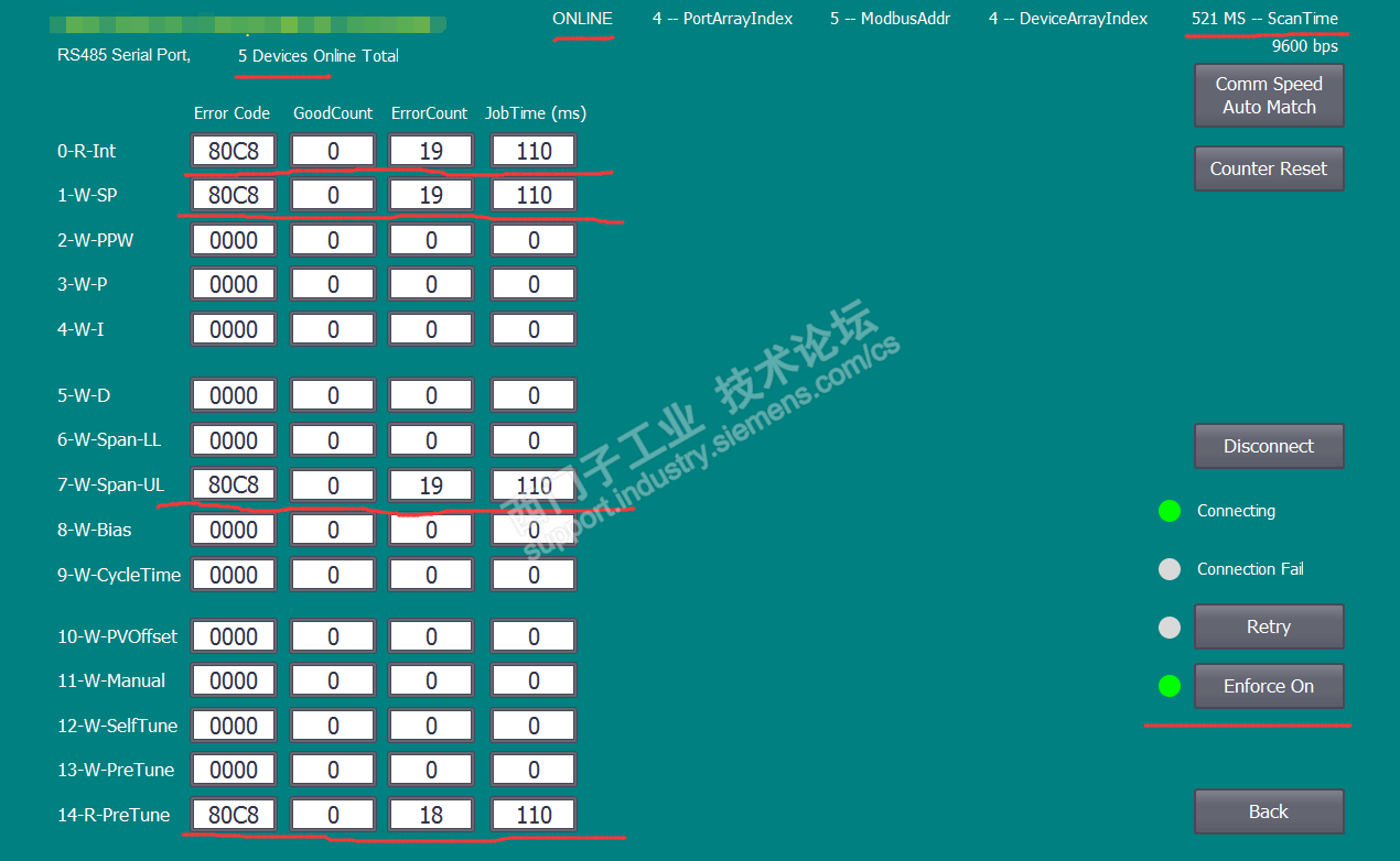 等等信息,都会显示在界面上,便于现场了解和诊断。便于根据硬件情况,在现场动态更改通信通道是连接配置。 每个设备的HMI通信监控效果如下: 比如:某品牌的Modbus设备总共有10个,其中的第6个设备,被连接在第2个485模块上,且和其它种类或品牌的设备一起在该端口排队,被排在了该端口的第3位。 你可能有多个485模块,每个模块连接了多个不同种类或品牌的Modbus设备。你的多种品牌或多类设备,每一品牌或每一类,都可以有多个相同的Modbus设备。 每个485模块,和设备种类与品牌之间,不一定是有规律按分组连接的。很可能由于种种历史和现状原因,在现场穿插交错和更改接线,等等情况。 这都要求调度的灵活性。也就是架构的低耦合,随时扩展,随时剪裁增删。且还要功能完善,健壮易用易诊断,程序要尽量简洁,尽量缩短需求变化带来的编程时间,尽量易于隔离调试错误,提高调试的一次通过率,等等要求。