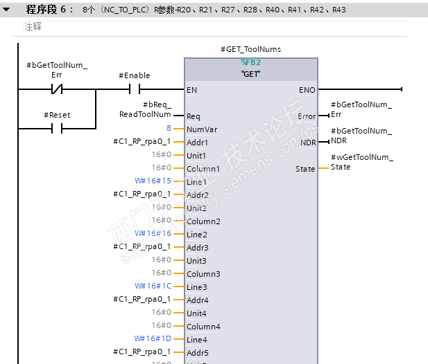 主题:FB2 FB3 line 的应用问题求助 在使用FB2 FB3 读写NC变量的时候 我看到手册里面写着 line 这个引脚的作用是对地址进行偏移 假设 ADDR1 我输入一个R20 那我再 line1 输入一个 w#16#1 我会得到一个R20 偏移1个的数据 也就是R21 但是 实际情况是 无论我 Line1 输入什么参数,这个偏移一直没有执行,请教各位大侠,这是怎么回事 CALL "GET" , DB500 新建一个背景数据块 Req :=M0.3 激活点,需要上升沿 NumVar :=2 读取变量的数量 Addr1 :=DB120.C1_SEMA_measPos11_5, 通过ncvar生成的变量名称 Unit1 := Column1:= Line1 := Addr2 :=DB120.C1_SPARP_progName_3 通过NCR生成的变量名称 Unit2 := Column2:= Line2 := Addr3 := Unit3 := Column3:= Line3 := Addr4 := Unit4 := Column4:= Line4 := Addr5 := Unit5 := Column5:=