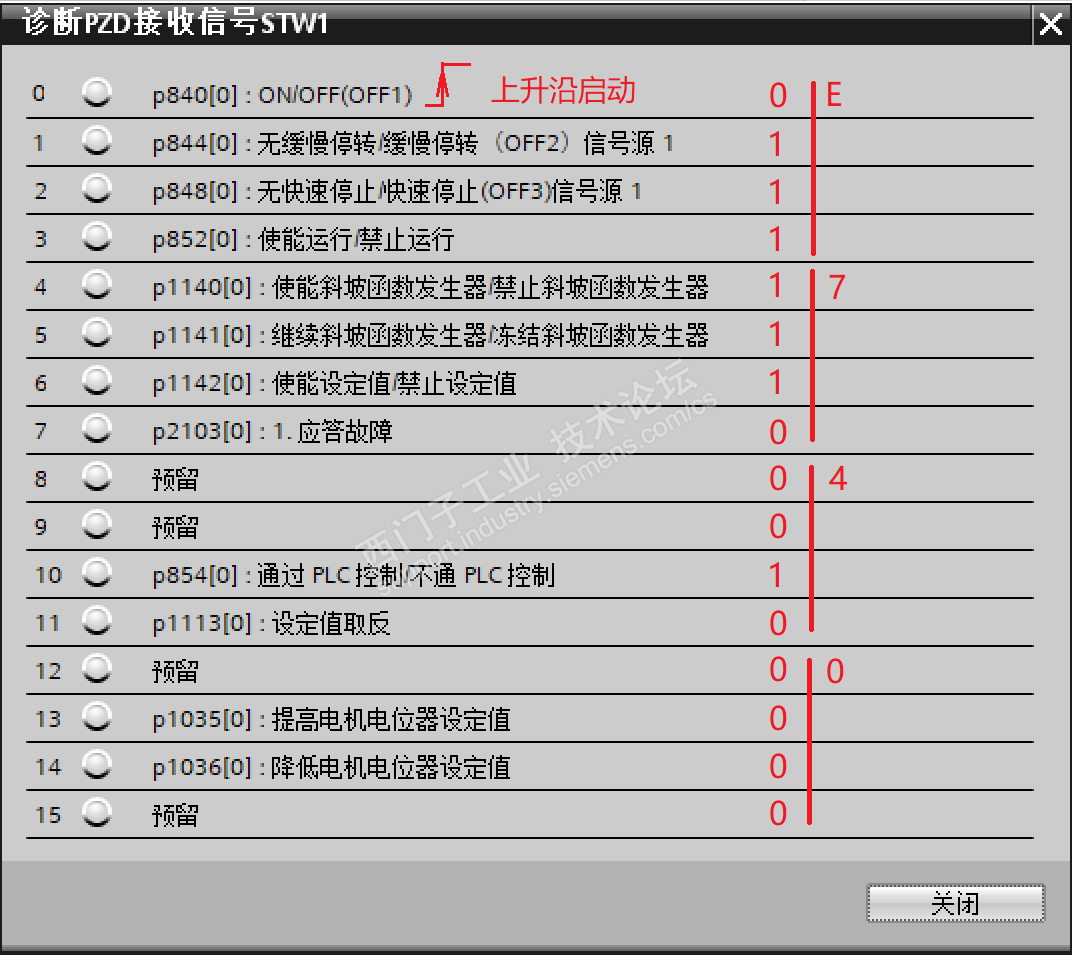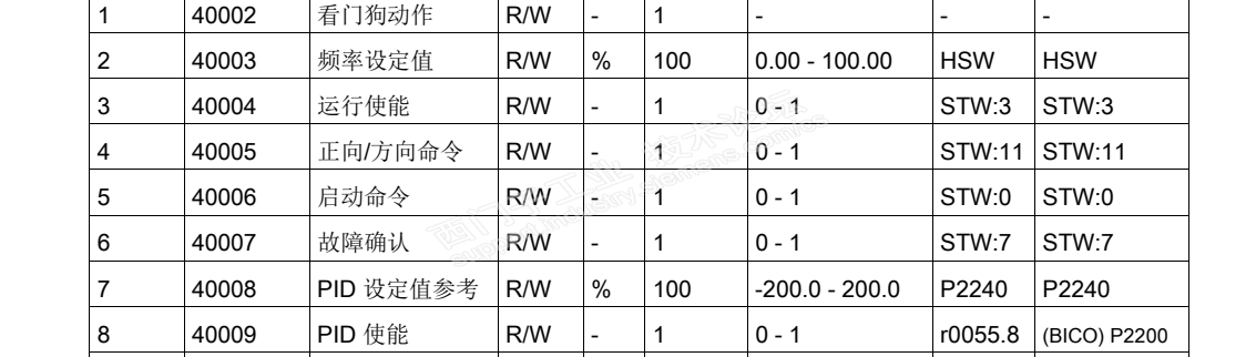 主题:回复:西门子V20变频器MODBUS 通讯时控制字怎么写V20的手册中,通讯方面的ModBus介绍,确实编写的不太好。 对于熟悉西门子报文的人来说,很容易。没接触过的控制字、状态字的新手,一头雾水。 你就看这个吧。操作 40100各个位: 40101给转速就行了。40101按hex4000=16384=100%给出。这是我们常规的用法。 40003采用100倍的百分比给出。2500就是25.00%