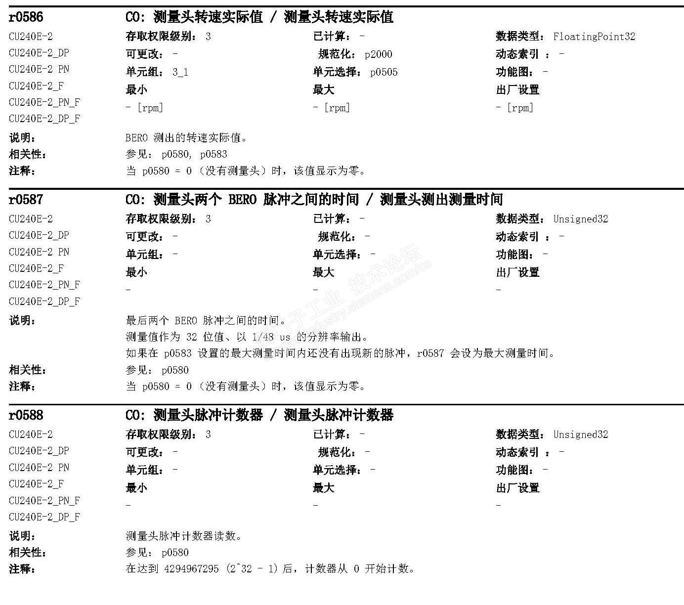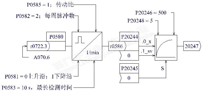 主题:学习G120的脉冲信号接收功能 G120的CU240E-2开关量输入端子,DI3可以接收测头的脉冲输入信号。这个基本很早就知道了。而且一直把它拿来作为接近开关传感器,测量电机输出轴转速使用。如下图示: 图中参数r586的单位是rpm,转速直读。假如通过后面的自由功能块,做一个滤波,即可得到比较稳定的电机转速信号实际值显示。不过参数r20247的值就是以P2000标定的转速值作为%的信号了。 那么这个测头脉冲信号的读取时隙是多少呢?它是如何把脉冲读取后处理成转速的信号的呢?有人深究此问题,搞得我是一脸懵。于是查阅G120的相关说明和技术指标,无果。在没有方向的时候,回看G120的参数表手册,看看参数P580至r586怎么说?没有任何关于时隙的说明。失望中无意发现r586后面的参数r587,眼前一亮。哇塞,原来如此。 终于明白了G120处理这个测头脉冲信号的方法是测周法。不是测频法。帅呆了。难怪它可以每周1个脉冲信号也允许! 同时也知道了,这个测头脉冲的读取有三个功能,第一是可以测转速rpm;第二是可以测脉冲的时间周期us为单位;第三个是计数功能,可以读取测头的脉冲数。 综上,你想做点什么?用G120的这个测头脉冲信号的接收功能,不是很方便吗?耶!