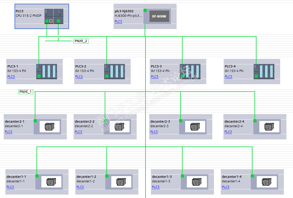 主题:【跨新年】采用PN-IO通讯解决300PLC连接数问题 大家都知道300系列PLC的以太网连接数是很有限的,最常用的315-2PN/DP只支持16个以太网连接数,也就是说S7通讯加PG通讯加OP上位通讯一共不能超过16个连接。在DP网络盛行的年代,主站与子站通讯大多采用DP网络,以太网通讯仅用于上位和PLC站点间,16个连接数足够使用,但是目前是以太网的天下,几乎所有站点通讯都首选以太网,16个连接数明显不够了。 21年实施过一个老厂改造项目,原主站是315-2PN/DP,原设计8套滗水器采用硬接线方式与主站连接。改造需要增加4套远程IO子站用于接收新增设备信号,还要将原有滗水器控制站增加200smartPLC实现多段速控制,这样滗水器原有的硬件连接方式就不能适应新的控制要求,于是改为采用以太网方式与主站通讯。设计改造方案的时候没在意原315主站的以太网连接数问题,还是计划采用PUT/GET的方式。实际调试时发现由于上位机数量较多,剩余连接数已经不足8个,没法通讯。可要想更换317已经来不及了,已经没有预算了。幸亏西门子20年推出了2.5版本的固件使200smart支持智能设备功能,可以作为PN-IO的子站与300主站通讯,而315的PN-IO通讯是不受16个以太网连接数限制的,可以支持到128个。一下子拨云见日,采用PN-IO通讯不仅不需要再编写PUT/GET通讯指令,只需要在200smart软件中配置并到处GSDML文件再导入到博图软件中就可以将通讯数据映射到IO数据区,还可以通过状态监控地址很方便的诊断通讯质量,非常方便。最终实现网络拓扑如下: PN-IO通讯不仅使用方便,还可以极大扩展300等老PLC的功能限制,也增强了200smart等小型化PLC的竞争力,可以说是西门子非常良心的功能。目前有不少国产厂家推出支持PN-IO通讯的远程IO模块或网关模块,这又进一步提升了200smart和1200等小型PLC的IO扩展能力,希望大家能用好这个通讯窍门。